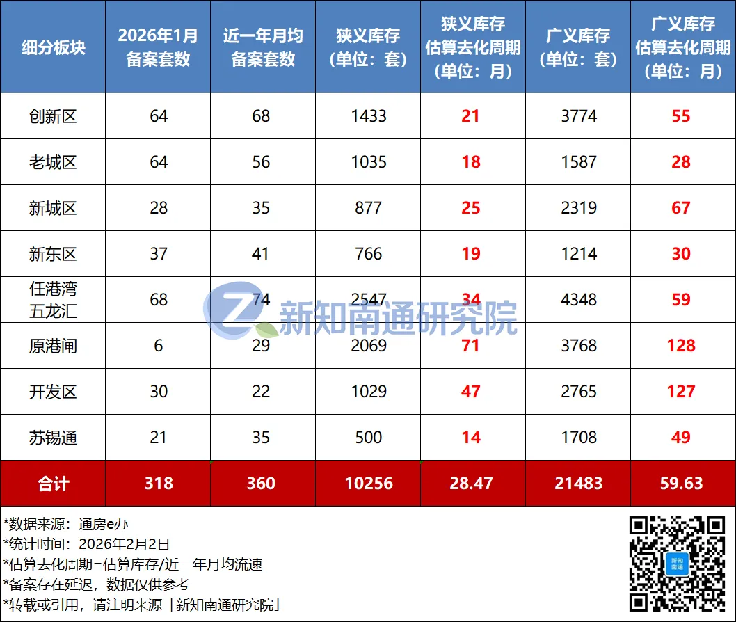 截至1月末,南通市区新房狭义库存(已获销许未备案)约1.03万套,按照近一年月均流速(约360套)估算,去化周期约28.47个月。