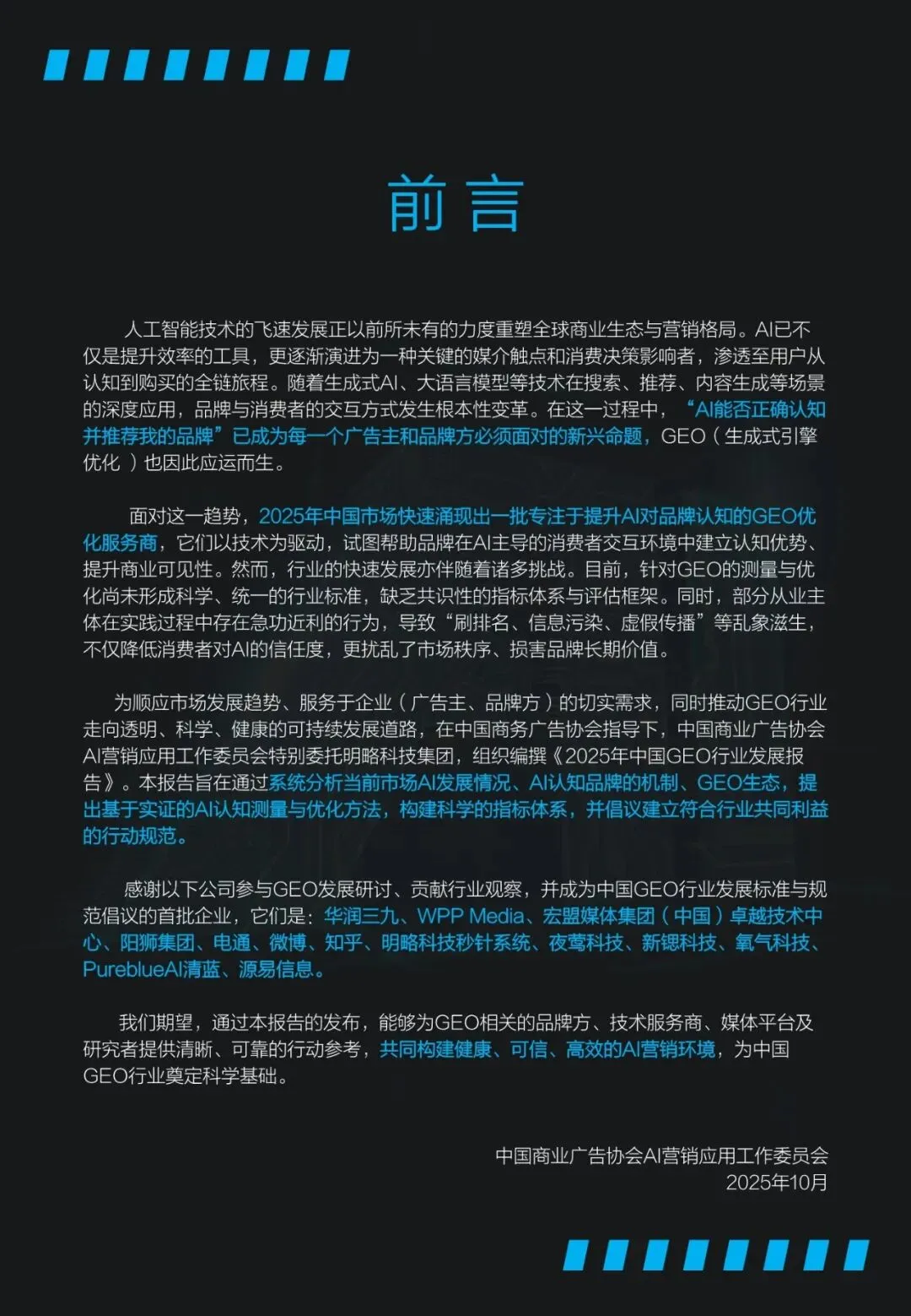 本报告旨在通过系统分析当前市场AI发展情况、AI认知品牌的机制、GEO生态,提出基于实证的AI认知测量与优化方法,构建科学的指标体系,并倡议建立符合行业共同利益的行动规范。