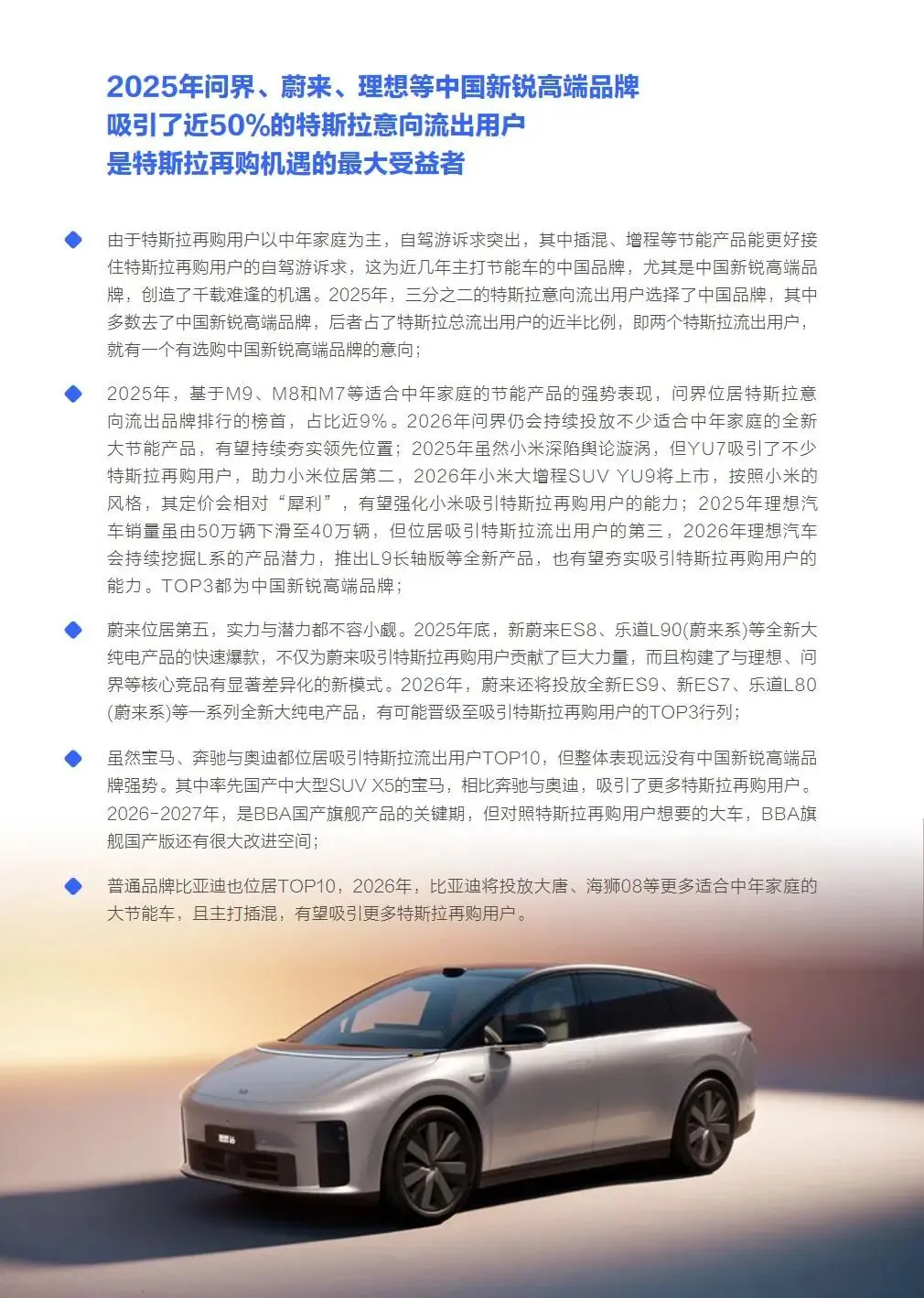 本报告聚焦特斯拉在华市场竞争力及再购用户需求变化,数据显示2020-2025年特斯拉在华销量持续攀升,积累近300万优质用户,核心价区集中20-35万元。随着十五五期间再购潮来临,其用户意向忠诚度仅30%左右,七成用户有流出意向。再购用户以40岁左右中年家庭为主,更关注空间、舒适、续航及自驾游适配性,与特斯拉现有产品布局及纯电战略存在诉求冲突。这一趋势已重塑高端车市竞争格局,中国新锐高端品牌凭借适配产品成为主要受益者,BBA及其他品牌亦在积极调整布局。报告通过多维度数据,剖析了特斯拉再购用户特征、需求痛点及市场竞争态势,为行业参与者把握市场机遇提供了关键参考。