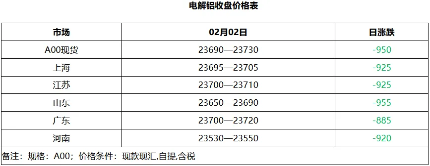 今日电解铝市场重心宽幅下挫,国内现货铝市场主流成交价格在23530-23720元/吨之间。期盘继续深度回撤,现货下挫较多。沪铝上午盘面低开后继续深度下挫。主力跌1680元/吨至23635元/吨,近月跌1505元/吨至23595元/吨。华东地区对2月贴水210元/吨,华南地区对2月贴水210元/吨。