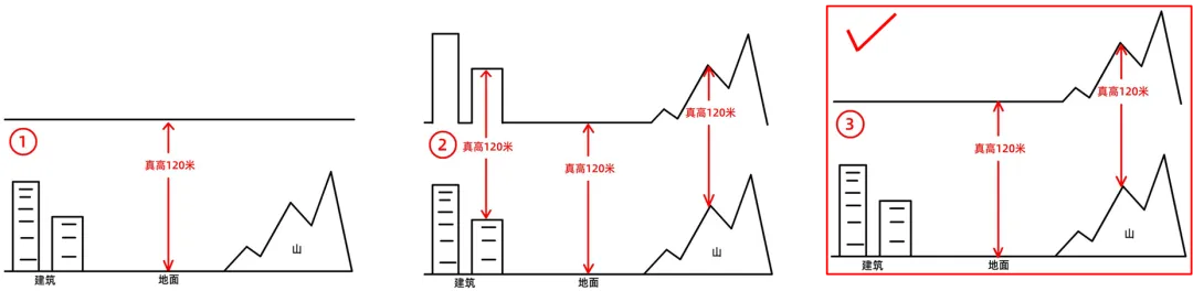 针对真高的多种理解明确真高定义,是指飞行器距离地面的垂直高度,此地面包含山体面但不包含建筑物表面。
