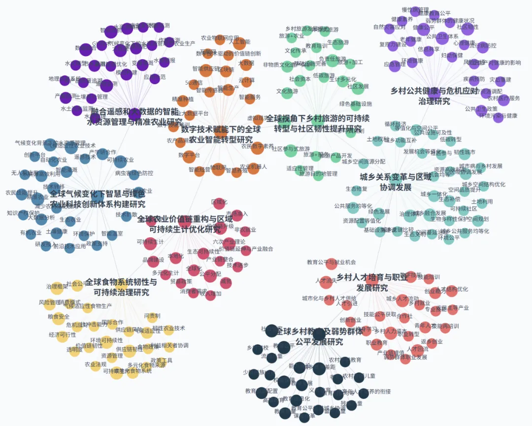 这些主题围绕粮食安全、乡村产业、生态环境、乡村治理、乡村民生福祉、乡村规划、科技应用与农村基本制度八大支柱,构建出相互关联且动态发展的知识体系。