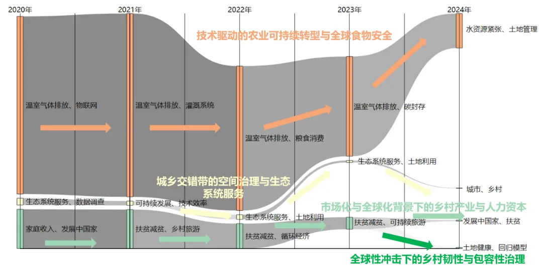 第一,“技术驱动的农业可持续转型与全球食物安全”已成为国际乡村研究的核心议题,并呈现出从工具赋能向系统性、目标导向转型的显著趋势。具体而言,“温室气体排放”在2020-2023年持续成为研究热点,凸显气候变化问题在全球农业领域所具有的根本性挑战地位。研究焦点呈现清晰的演进路径:2020年研究主要集中于“物联网”为代表的通用数字技术在农业中的赋能作用,2021年深入到“灌溉系统”等关键生产环节的水资源管理,2023年研究则转向以“碳封存”为代表的气候应对技术,整体体现出从“基础赋能”到“场景应用”再至“目标攻关”的递进逻辑。2024年,议题进一步聚焦于“水资源紧张”与“土地管理”两大基础性资源约束,其破解对农业可持续转型和全球食物安全具有重要意义。