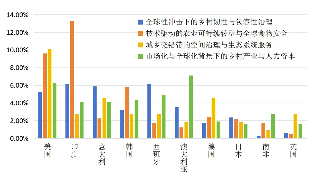 第一,亚洲国家在国际乡村学研究中表现出鲜明的技术应用导向。印度在“技术驱动的农业可持续转型与全球食物安全”研究中表现尤为突出,参与度高达13.30%,凸显其作为信息技术大国将数字技术深度融入农业转型的战略特点,尤其在精准农业、农业物联网和人工智能应用等方面取得多项创新成果。韩国在“技术驱动的农业可持续转型与全球食物安全”及“市场化与全球化背景下的乡村产业与人力资本”两个领域参与度分别为5.79%和4.38%,反映其在智慧农业与价值链升级方面的明确政策投入。日本整体参与度均低于2.5%,相对分散,但在乡村韧性与包容性治理方面有所积累,与其长期应对老龄化与乡村空心化的社会背景密切相关。