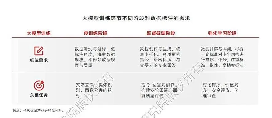 大模型的进步离不开算法、算力、数据三大支柱,而数据标注服务贯穿大模型训练全流程,从预训练阶段的海量数据清洗,到监督微调阶段的指令-回答对创作,再到强化学习阶段的评分排序,每个环节都对标注质量提出了严苛要求。