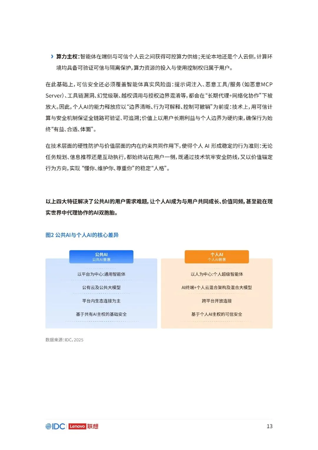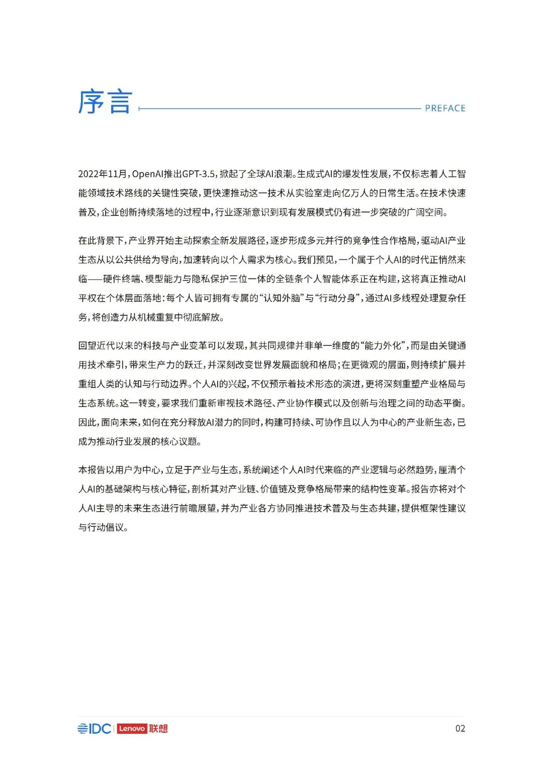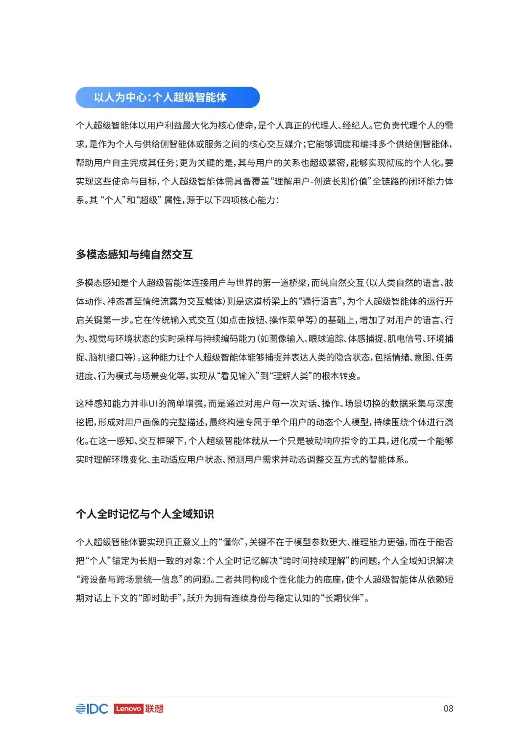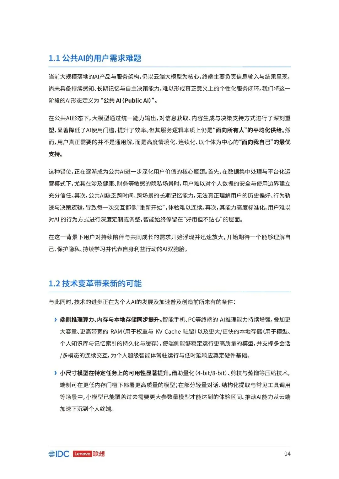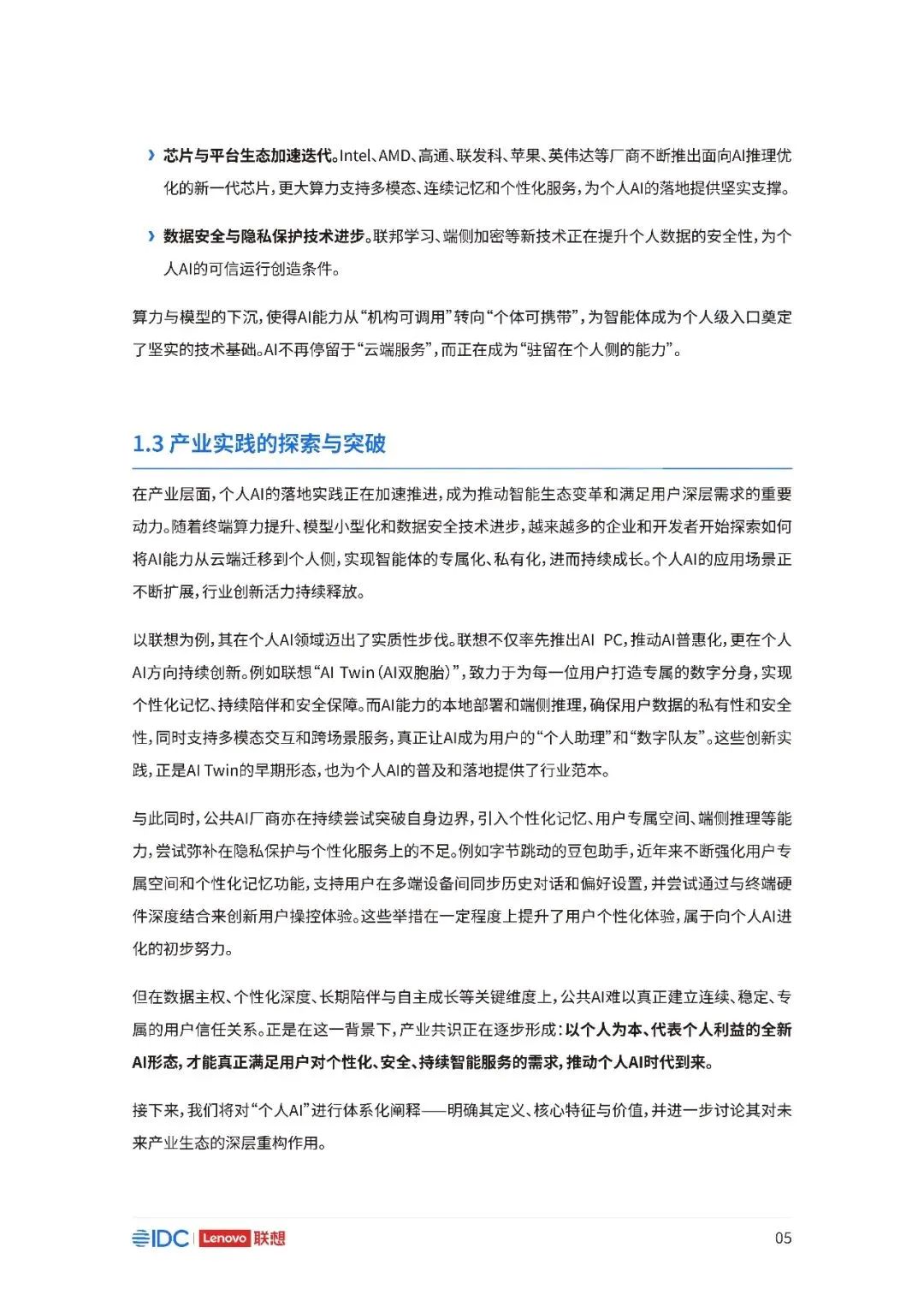 联想与IDC合作发布《个人AI产业定义、产业架构与发展趋势白皮书》。白皮书指出,越来越多的公共AI参与者,也开始从以公共AI为主,向个人AI方向进行迁移,“业界已形成共识,个人AI是未来创新和普惠的关键方向。”