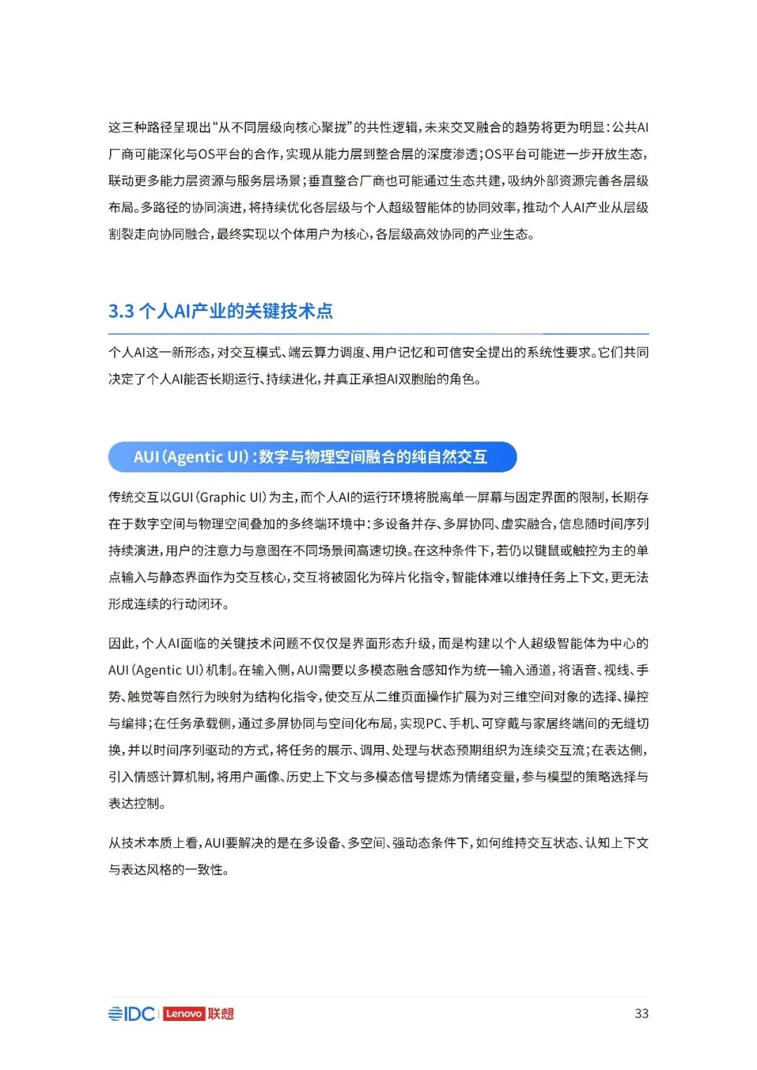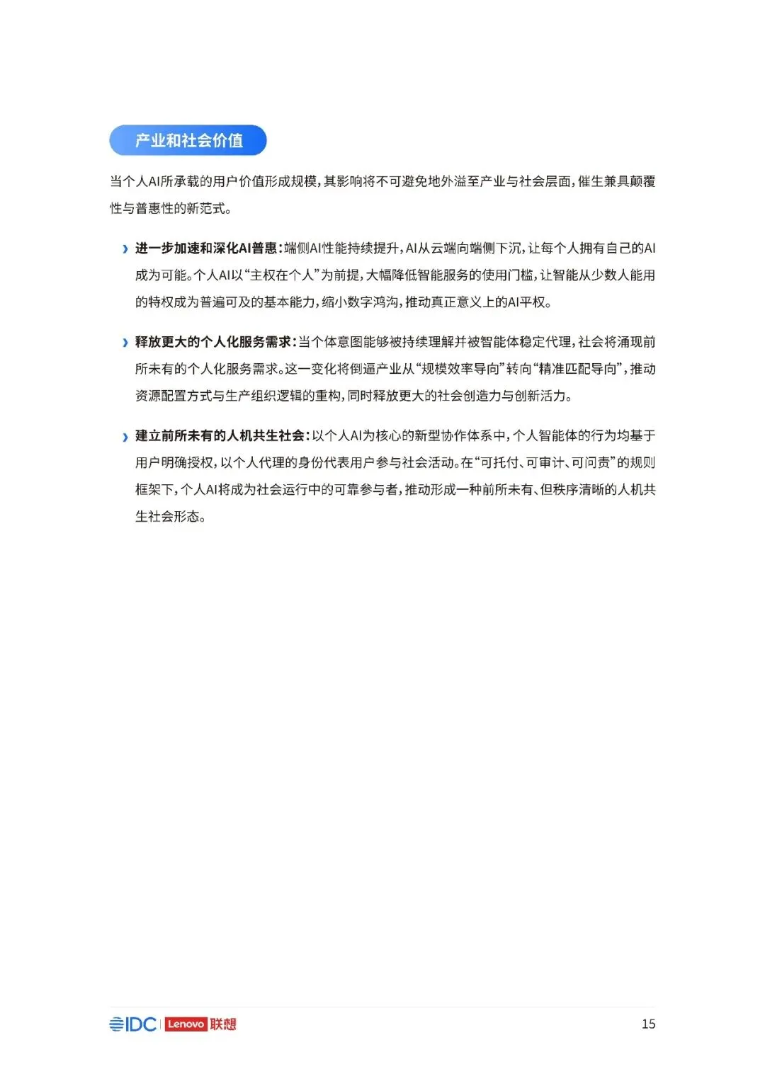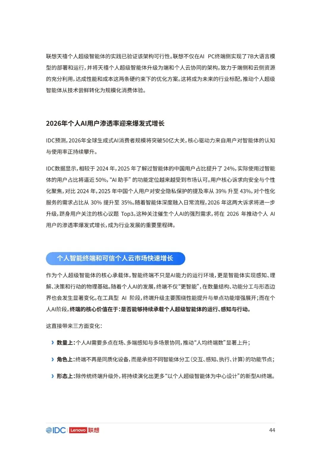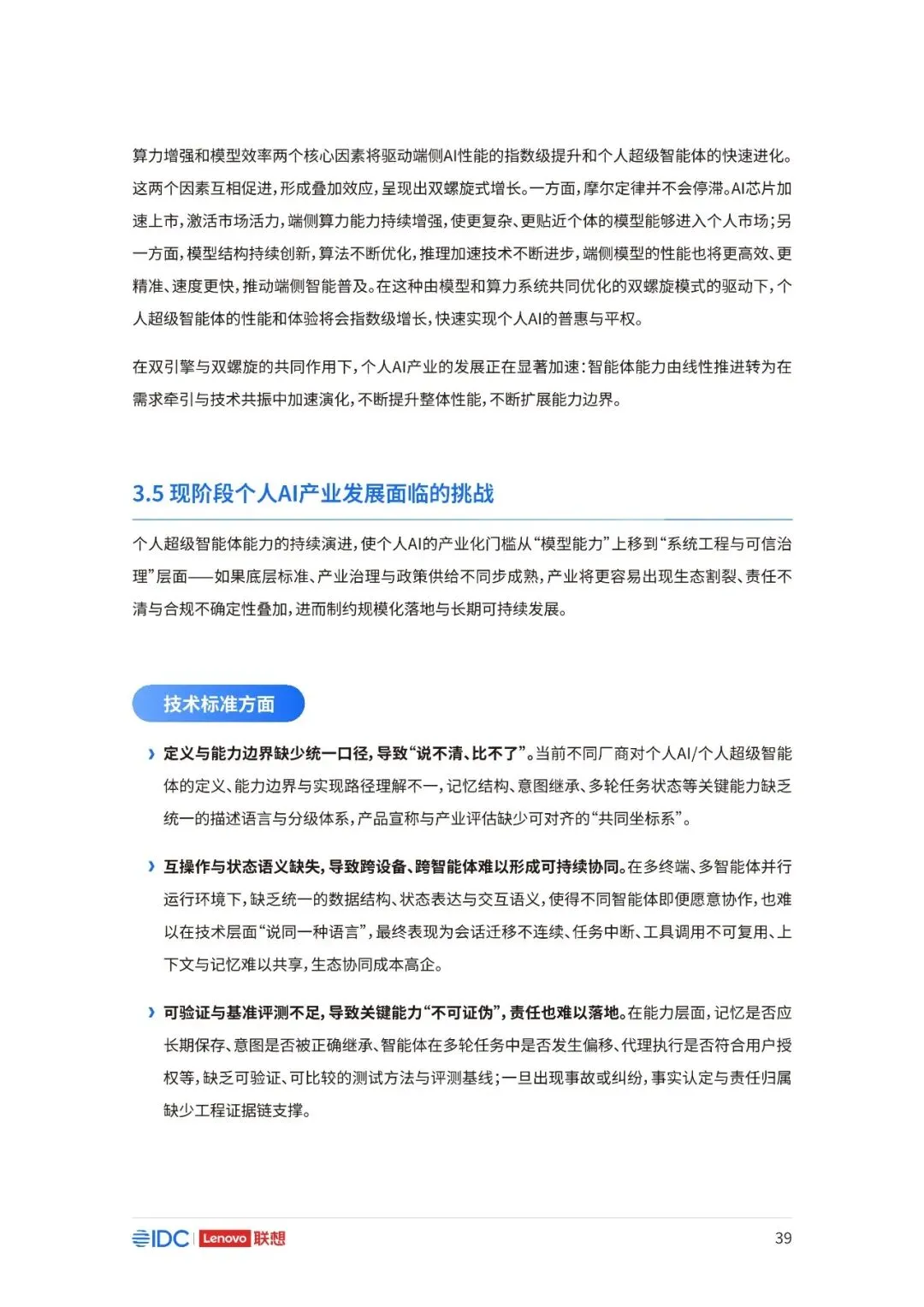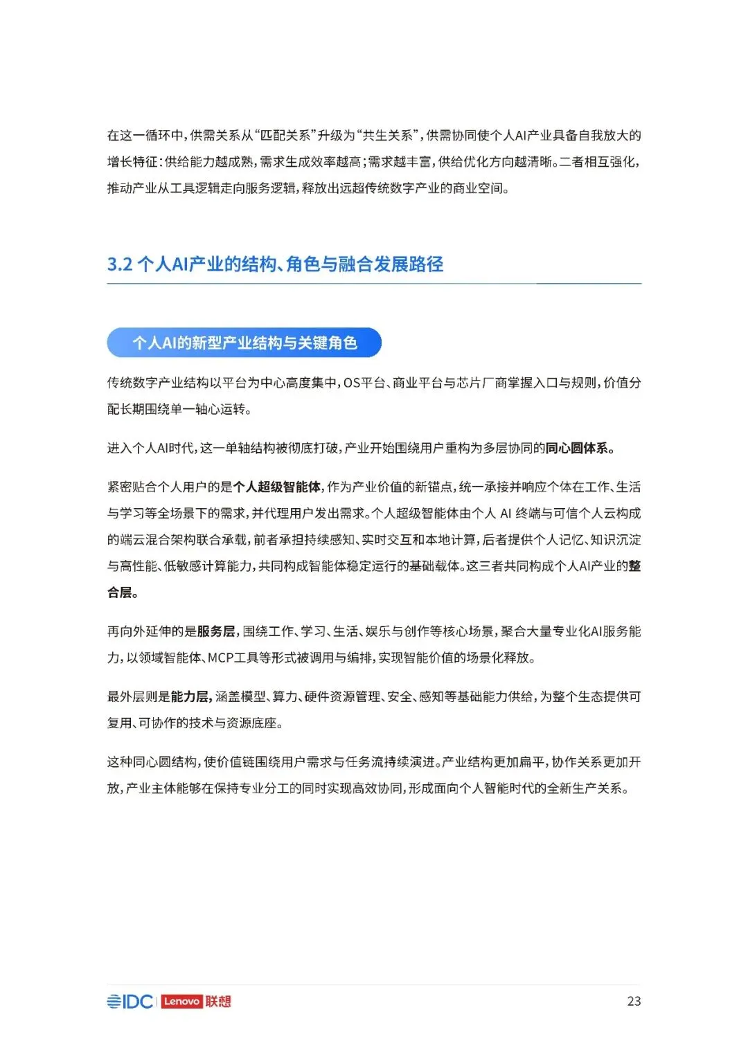 联想与IDC合作发布《个人AI产业定义、产业架构与发展趋势白皮书》。白皮书指出,越来越多的公共AI参与者,也开始从以公共AI为主,向个人AI方向进行迁移,“业界已形成共识,个人AI是未来创新和普惠的关键方向。”