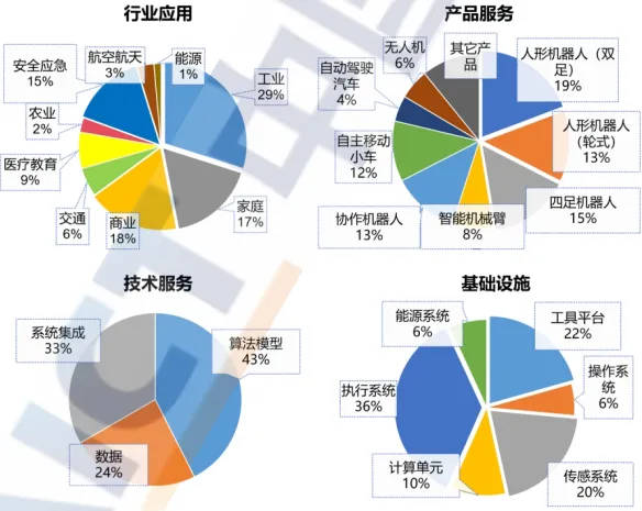 四大板块:行业应用(工业/家庭/商业)、产品服务(机器人本体)、技术服务(算法/数据)、基础设施(芯片/传感器)。