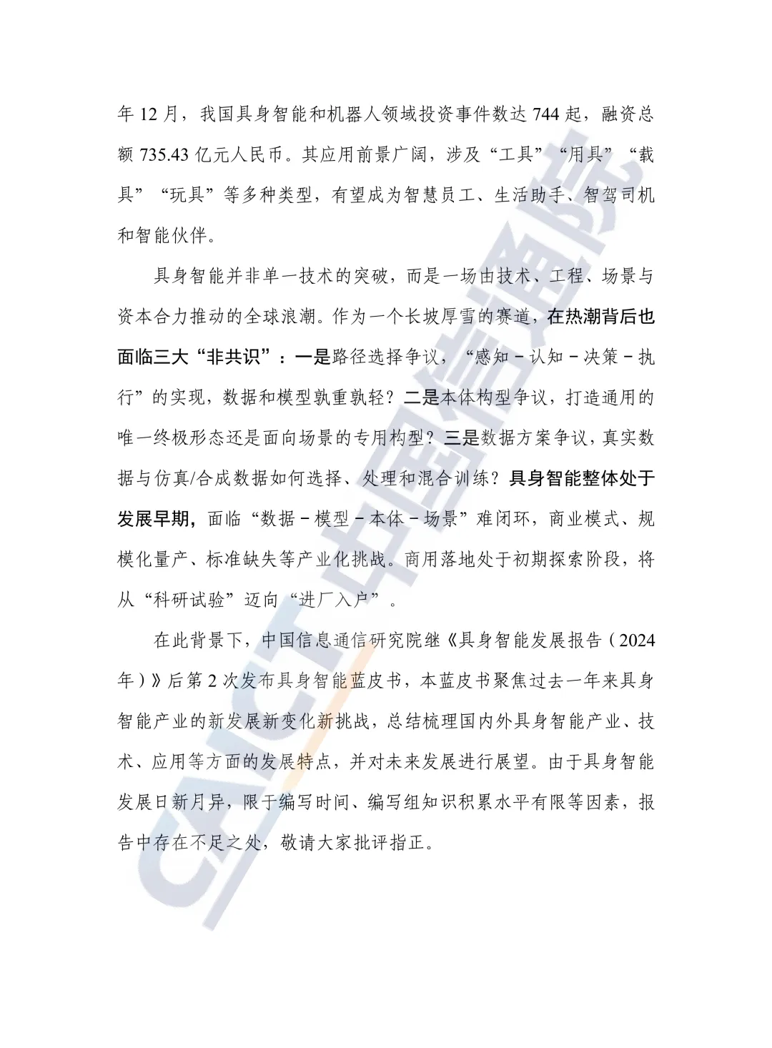 在此背景下,中国信息通信研究院继《具身智能发展报告(2024年)》后第2次发布具身智能蓝皮书,本蓝皮书聚焦过去一年来具身智能产业的新发展新变化新挑战,总结梳理国内外具身智能产业、技术、应用等方面的发展特点,并对未来发展进行展望。