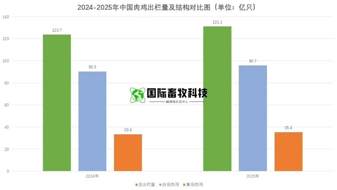 从养殖规模来看,2025年全国商品鸡出栏量达131.1亿只,同比增长6.0%,其中白羽商品鸡出栏95.7亿只,同比增长6.0%,黄羽商品鸡出栏35.4亿只,同比增长6.2%。
