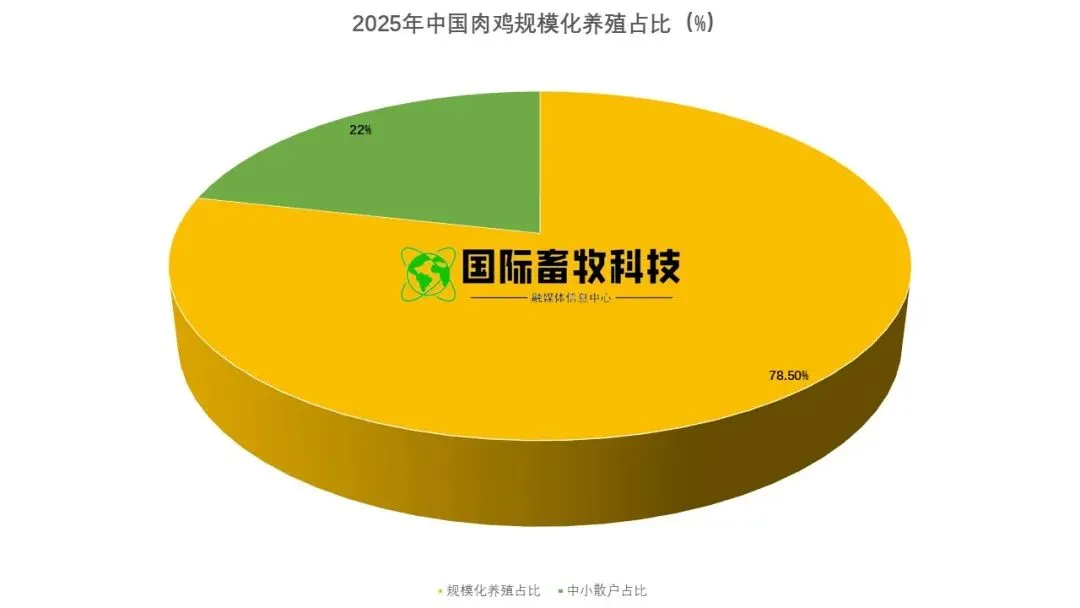 规模化养殖进程持续加快,年出栏量超100万只的规模化养殖场数量同比增长12.3%,规模化养殖占比达到78.5%,较2024年提升3.2个百分点;中小散户因抗风险能力弱、养殖效率低,加速退出市场,全年散户出栏占比降至21.5%,较2024年下降3.2个百分点。