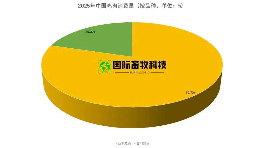 从产业结构来看,白羽肉鸡与黄羽肉鸡协同发展,白羽肉鸡凭借养殖效率高、成本低的优势,占据产业主导地位,2025年白羽肉鸡出栏量95.7亿只,占总出栏量的73.0%,鸡肉产量1930.2万吨,占总产量的80.3%;