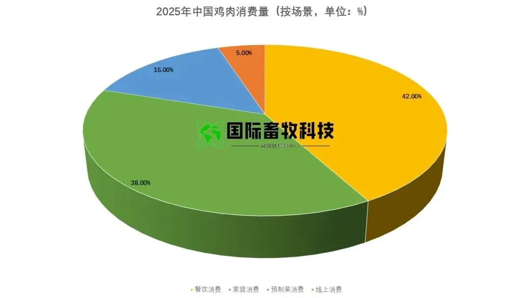 从消费场景来看,消费场景日益多元化,传统家庭消费、餐饮消费持续稳定,预制菜消费、线上消费快速增长。2025年,家庭消费占鸡肉总消费量的38%,餐饮消费占比达42%,预制菜消费占比达15%,线上消费占比达5%。