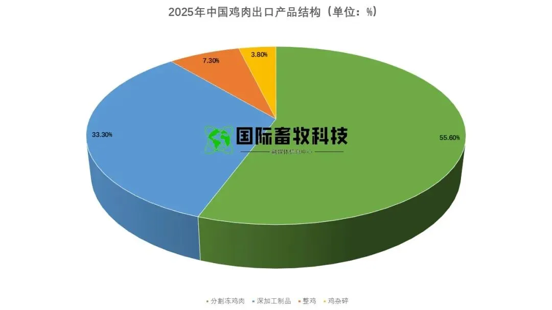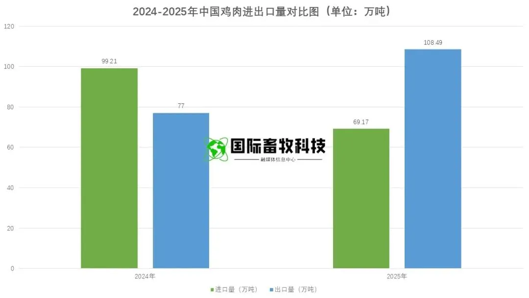 从出口情况来看,2025年中国鸡肉出口量达108.49万吨,同比增长40.9%,出口额达38.6亿美元,同比增长35.7%,首次实现出口量超过同期进口量,创造了中国肉鸡产业国际贸易的新纪录。