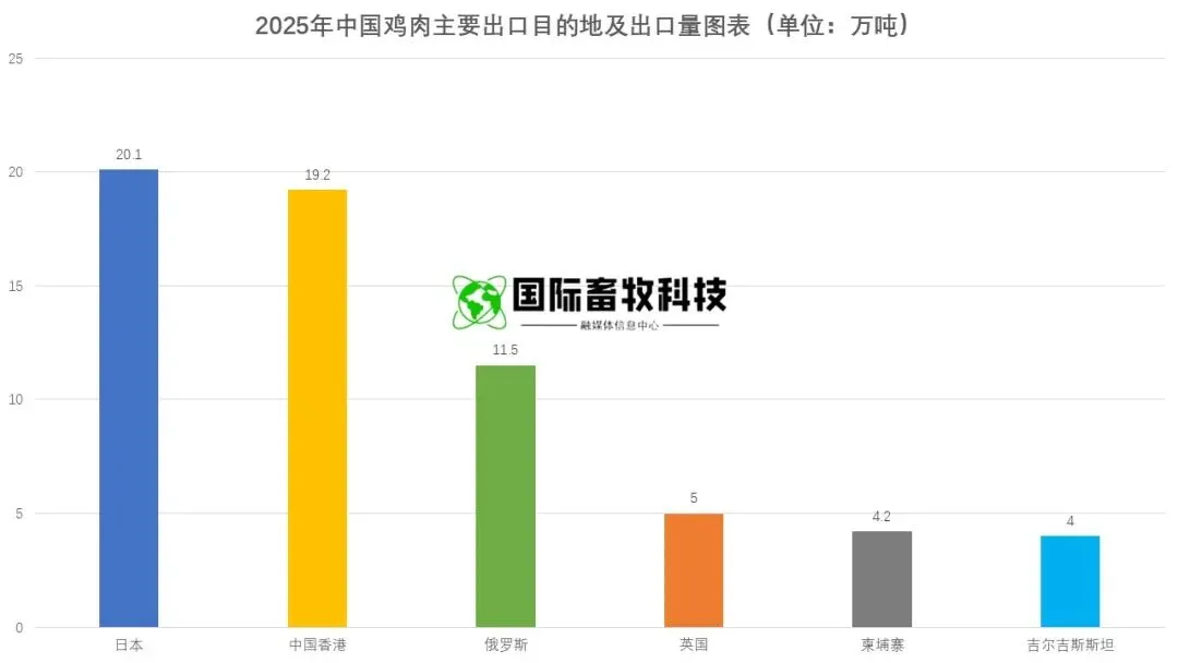 从出口区域来看,出口市场日益多元化,2025年共有120个国家和地区从中国进口鸡肉,其中进口量超过1万吨的有20个。