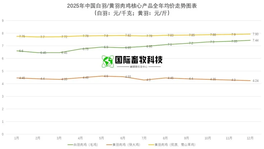 从白羽肉鸡价格来看,全年价格波动明显,呈现“年初低位、年中震荡、年末冲高”的走势。