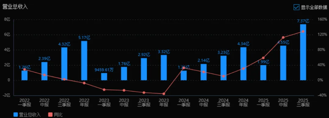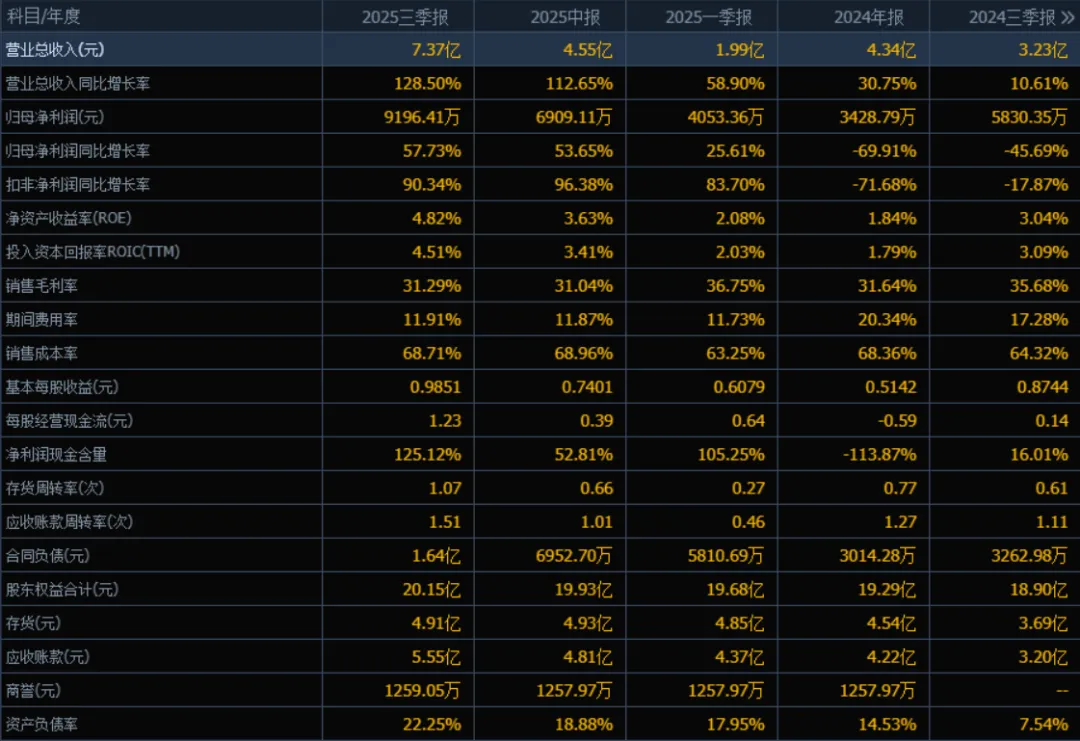 1) 营业总收入:2025年三季度营业总收入为7.37亿元,相较于2024年三季度(3.23亿元)增长了128.50%。评价: 公司营收规模在2025年呈现爆发式增长,增速持续提升(从一季度58.90%到三季度128.50%),显示其市场拓展和销售能力显著增强。