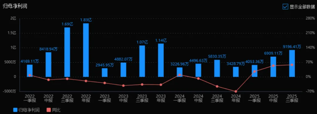 2) 归母净利润:2025年三季度归母净利润为9196.41万元,相较于2024年三季度(5830.35万元)增长了57.73%。评价: 在营收高速增长的同时,归母净利润也实现了大幅增长,扭转了2024年同期下滑的趋势,说明公司盈利能力和经营效率有所改善。