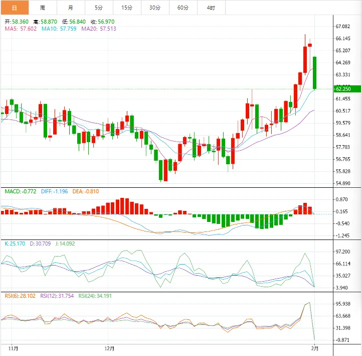 周一( 2 月 2 日 )亚市时段,美原油价格震荡下行,现交投于每桶 62.50 美元附近,日内跌幅约 4 % 。