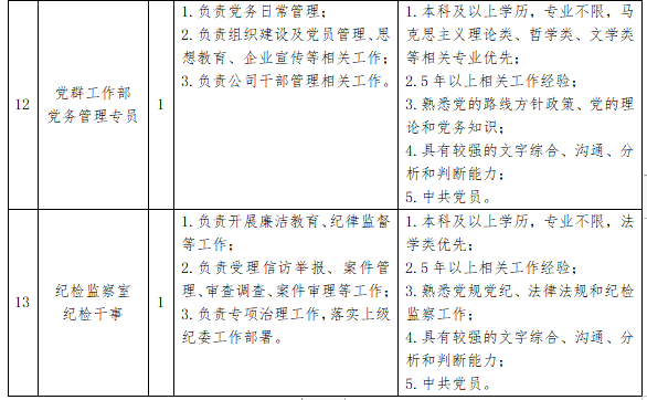 此次招聘岗位10个,共计13人,具体详见《吉林省铁路建设投资有限公司招聘岗位条件一览表》。