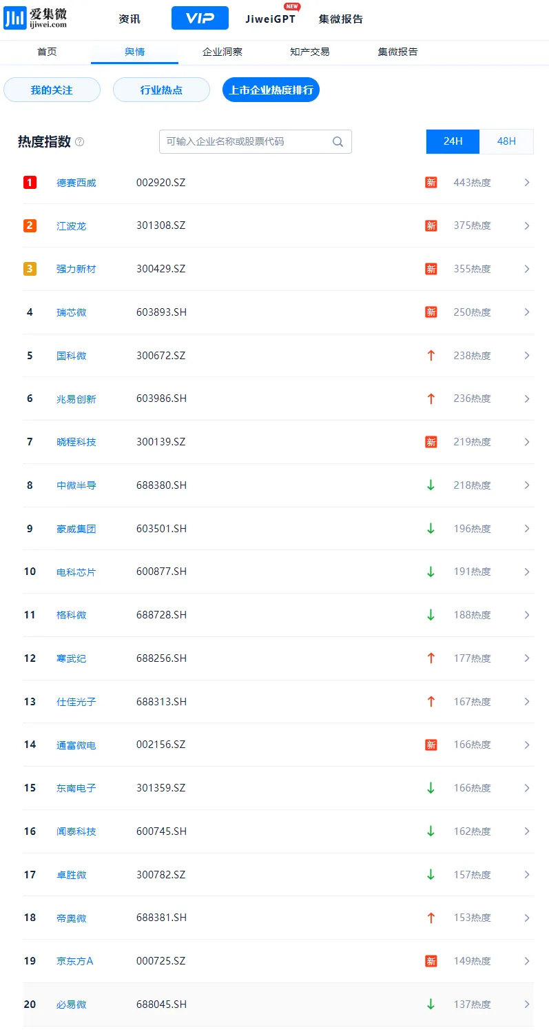 登录爱集微VIP频道,实时查看动态“上市企业热度排行”,穿透洞察每一个波动背后的驱动因素。