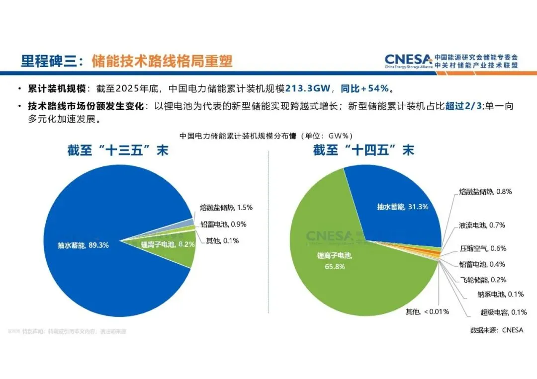 报告全景式呈现了"十四五"收官之际中国储能产业的跨越式发展。截至2025年底,中国电力储能累计装机规模达213.3GW,其中新型储能首次突破1亿千瓦(144.7GW),是"十三五"末的45倍,年均增速惊人。技术路线方面,锂离子电池以65.8%的占比主导新型储能市场,抽水蓄能占比则降至31.3%,储能技术多元化格局初步形成。