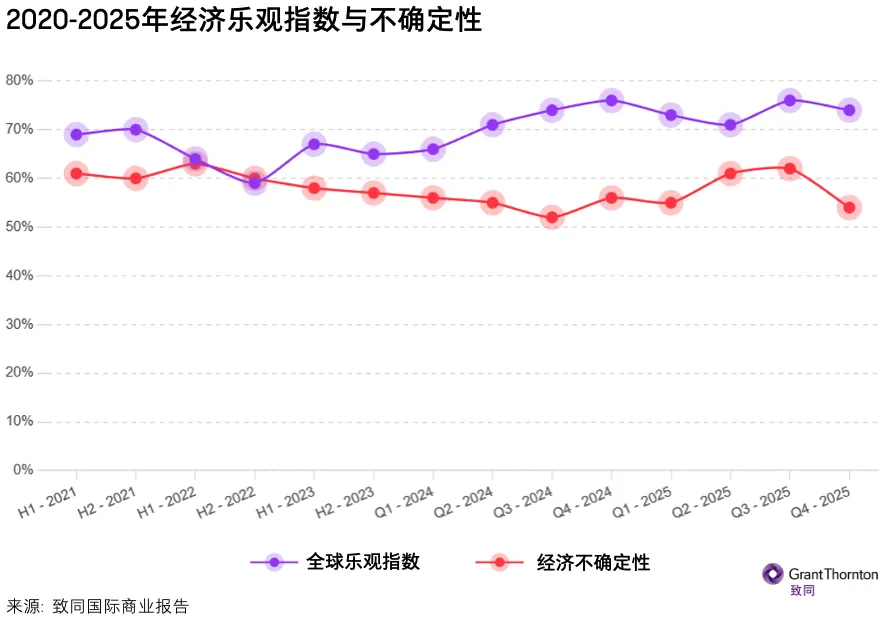 2025年第四季度,全球中端市场企业领袖的整体乐观情绪略有放缓,但对经济不确定性的担忧则出现显著下降。致同最新发布的《国际商业报告》显示,74%的受访者对未来12个月前景表示乐观(较上季度下降2个百分点);而将经济不确定性视为顾虑的企业比例则大幅降低了8个百分点。