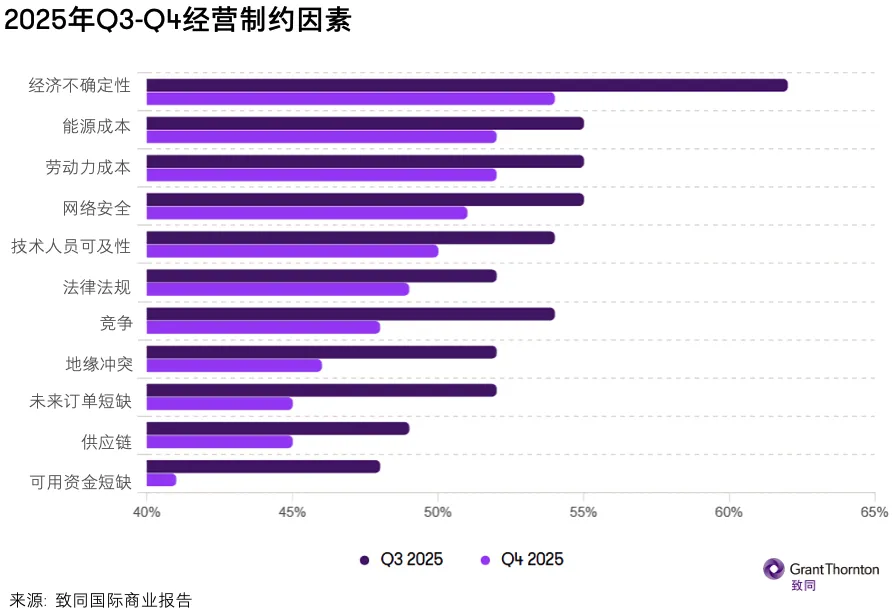 从各类经营制约因素的担忧程度普遍下降来看,企业对2026年似乎有理由抱持更佳预期:对经济不确定性的担忧下降8个百分点;对资金短缺的担忧下降7个百分点(仅41%企业视其为问题);对地缘政治动荡、竞争压力、未来订单不足的担忧均下降5-6个百分点;对供应链问题的担忧下降4个百分点(至45%)。本季度,致同所追踪的全部15项制约因素的担忧指数均呈下降态势。