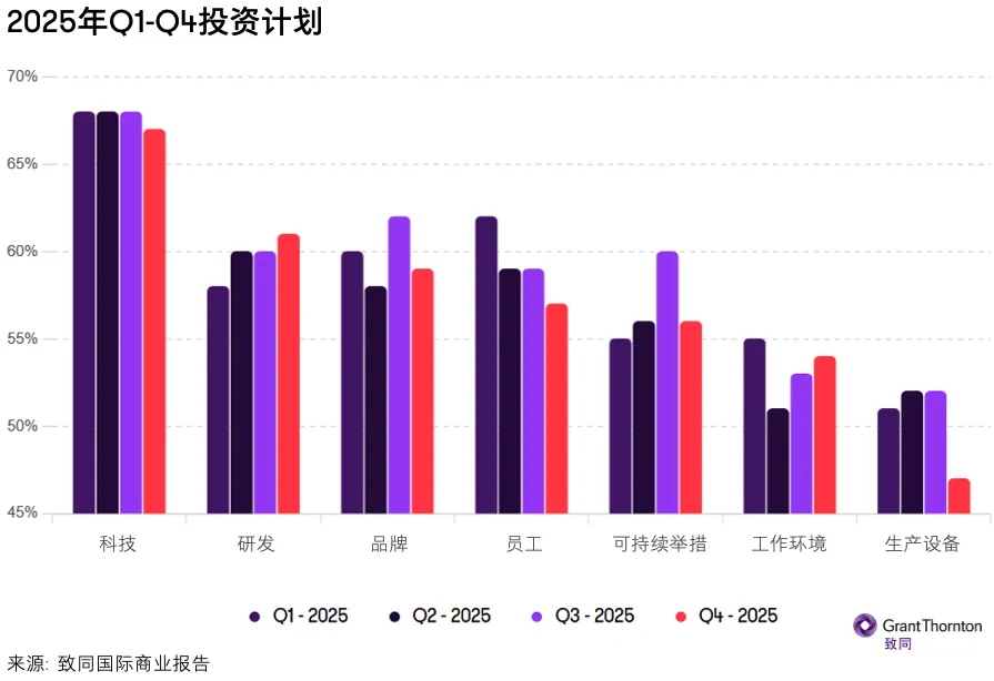 致同国际CEO Greg Keith总结道:“相比2025年年初,企业以更强劲的姿态结束这一年,供应端压力显著缓解,经济不确定性也降至两年来的最低水平。同时,企业领导者表现得十分务实,他们缩减了厂房、机械等重大资本项目投资,却加倍投入于技术、人工智能和研发领域,以夯实未来运营的基础。这种转向反映了一个清晰的优先级,优先追求韧性和生产率,而非盲目扩张。