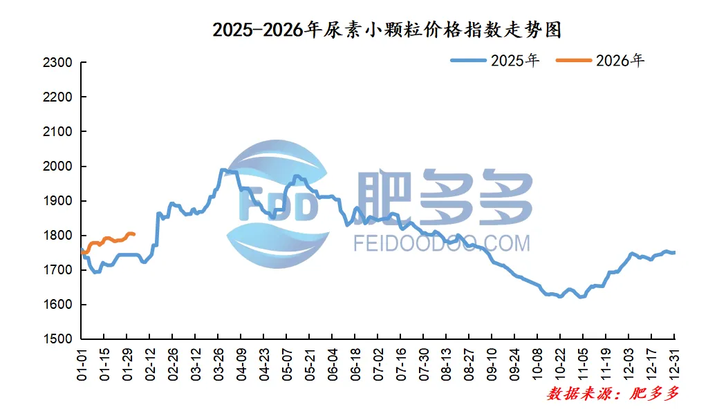 据肥多多数据测算2月2日尿素小颗粒价格指数为1802.27,较上一工作日下跌1.82,环比下跌0.10%,同比上涨3.42%。