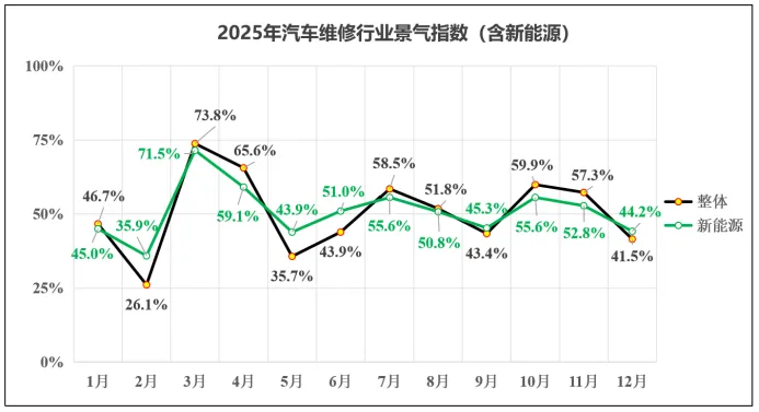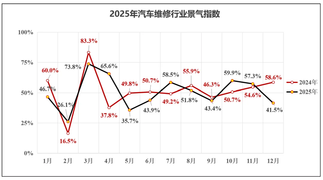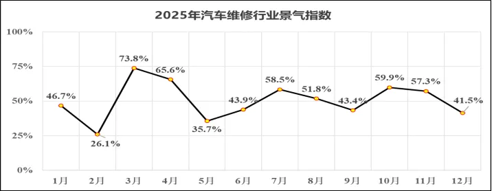 从月度走势看,2025年10—12月汽车维修行业景气指数分别为59.9%、57.3%和41.5%,整体呈现“先升后降”的运行特征。10月份指数环比大幅上升16.5个百分点,反映出行业景气快速回暖;进入11月和12月,指数分别环比下降2.6和15.8个百分点,行业景气明显回落。