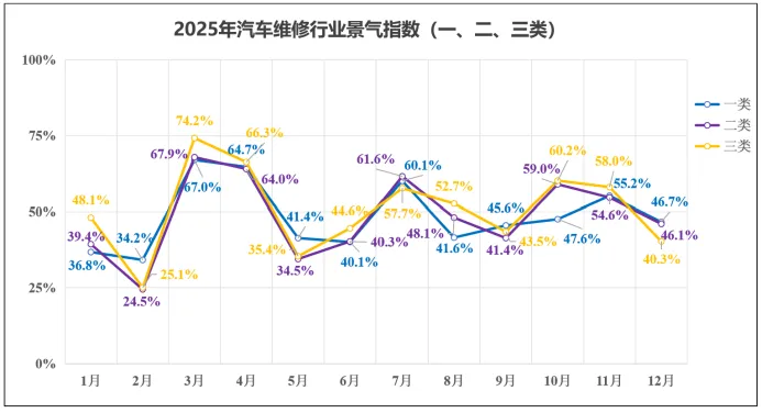 进入11—12月,受季节性消费降温、低温天气抑制作业效率以及年末支出收紧等因素影响,各类企业景气指数普遍回落。其中,12月三类维修企业景气指数为40.3%,明显低于一类和二类企业,反映出小规模、业务结构相对单一的维修主体在景气下行阶段承压更为明显。