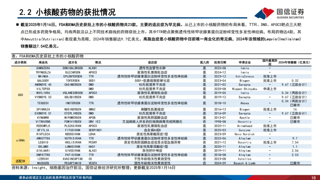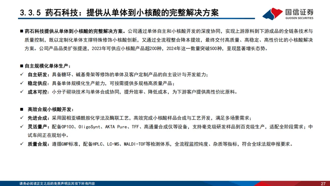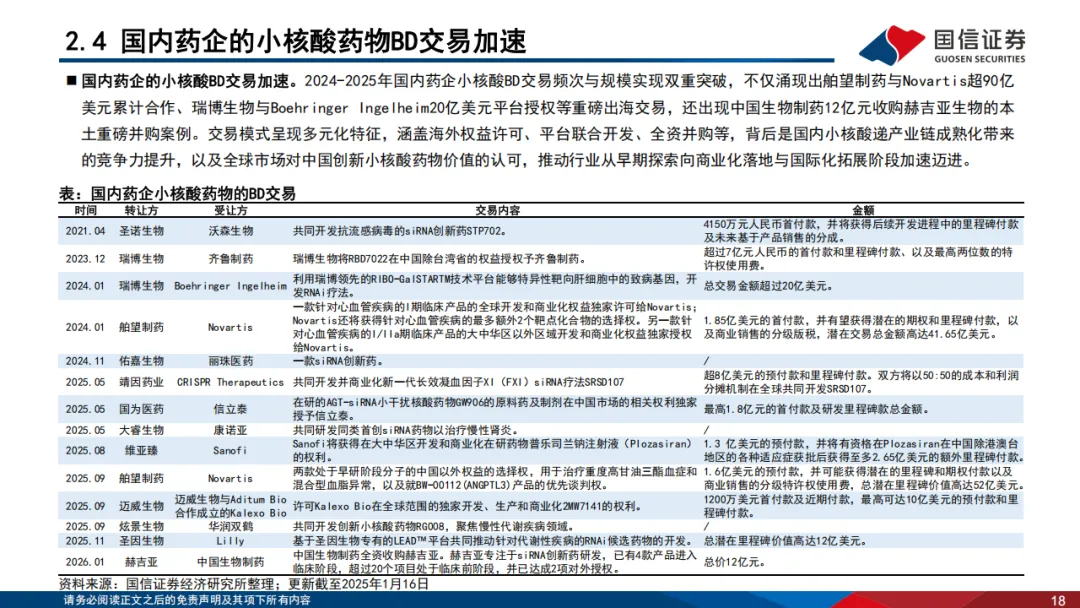 小核酸药物正迎来全球范围内的蓬勃发展期,已从技术验证阶段迈入临床兑现与商业化加速阶段。全球层面,2019–2023年,全球小核酸市场规模从27亿美元增长至46亿美元(CAGR为14.25%);预计2033年市场规模将攀升至457亿美元(CAGR高达26.08%)。全球累计获批上市药物已达23款,覆盖siRNA、ASO、适配体等多个技术方向。国内虽暂未实现产品上市,但研发管线数量仅次于美国,覆盖高脂血症、高血压、乙肝、肾病、肌肉疾病、肥胖等多个治疗领域,且涌现出舶望制药与Novartis超90亿美元累计合作、瑞博生物与Boehringer Ingelheim20亿美元平台授权等重磅出海交易,中国生物制药等传统药企也通过收购快速卡位,行业呈现出积极发展的态势。■ 小核酸CXO作为小核酸药物产业的核心支撑,受益于技术突破与商业化加速,行业景气度持续攀升。小核酸CXO行业同步进入发展快车道,形成“研发服务-中试放大-商业化生产”的CRDMO全链条服务体系。