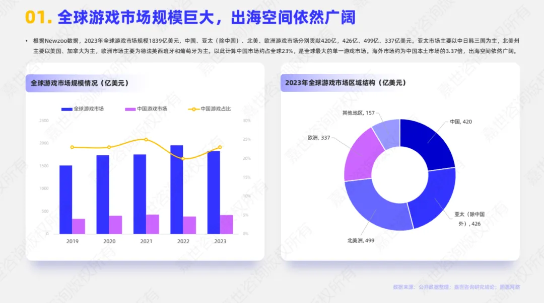 《2025 中国游戏出海行业报告》显示,2023 年自研游戏海外收入 164 亿美元,《黑神话:悟空》成现象级 3A 代表。报告重点分析 SLG、休闲游戏品类优势,美日韩及东南亚为核心市场。