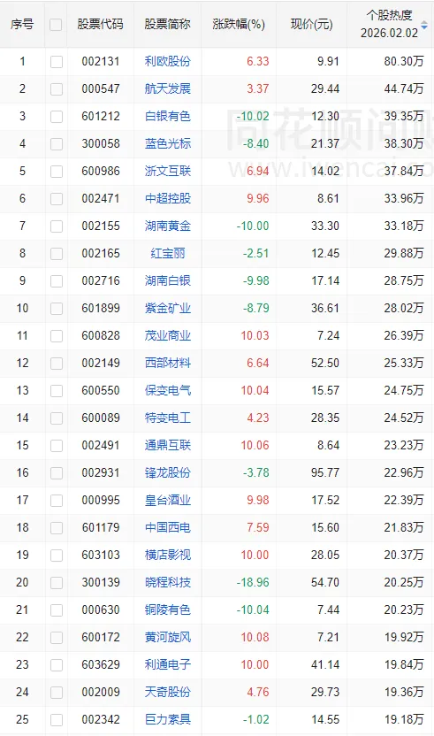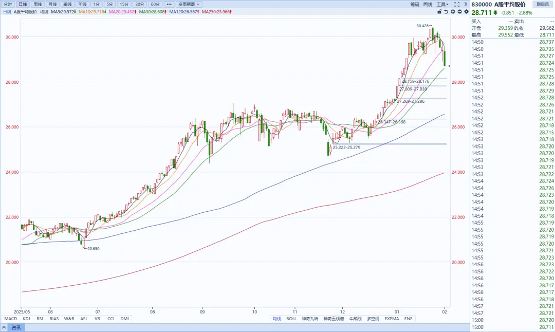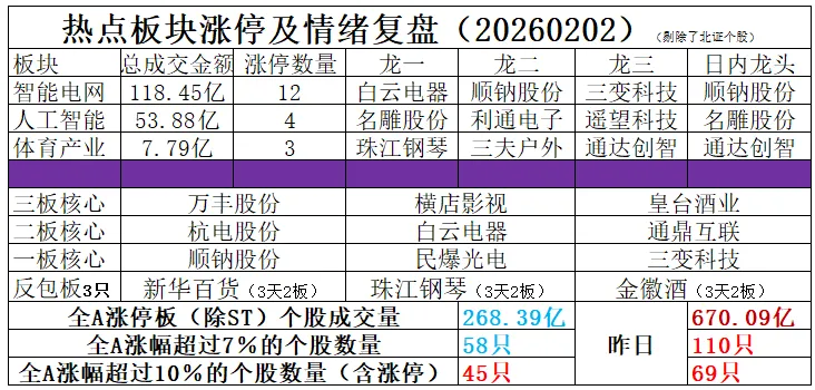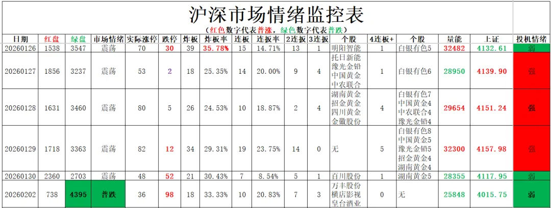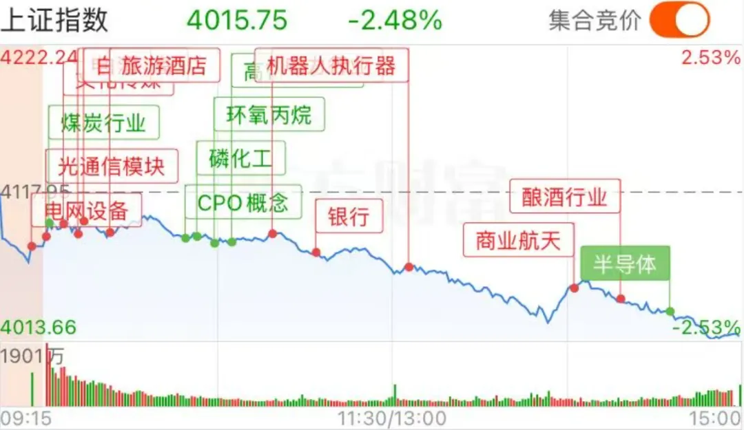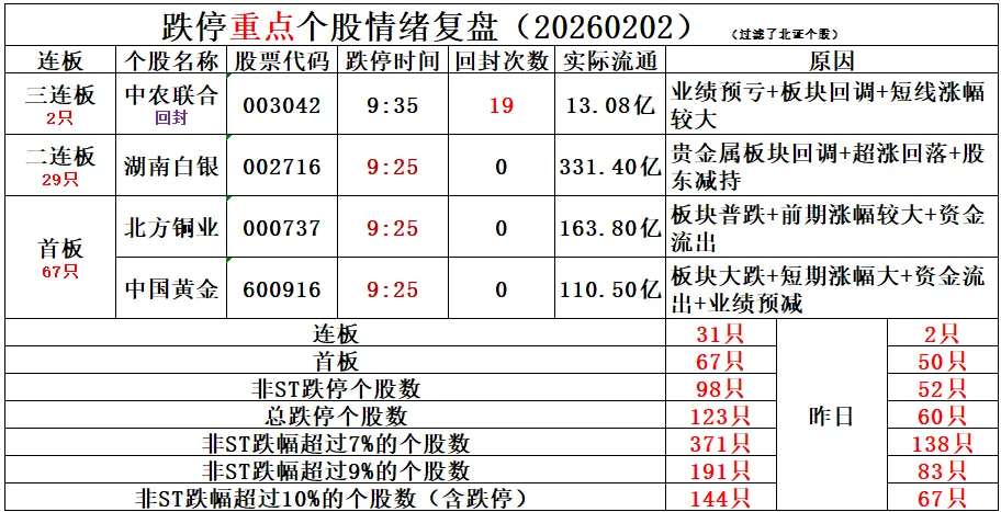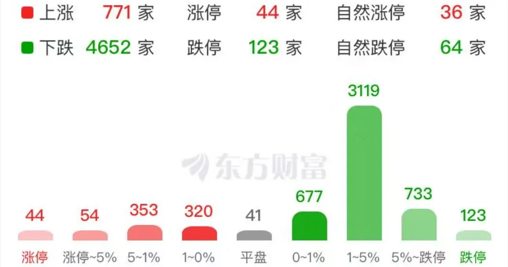 个股方面:涨少跌多,771只个股上涨,4652只个股下跌。盘面上,全市场超4600只个股下跌,其中123只个股跌停。从板块来看,白酒概念反复活跃,皇台酒业3连板,金徽酒3天2板,水井坊触及涨停。电网设备概念逆势走强,汉缆股份、白云电器、三变科技、保变电气等多股涨停。下跌方面,有色金属、油气、化工、煤炭、半导体等板块跌幅居前。其中有色金属板块遭重挫,四川黄金、赤峰黄金、铜陵有色、西部矿业等多股跌停。存储芯片概念大跌,兆易创新、开普云跌停。