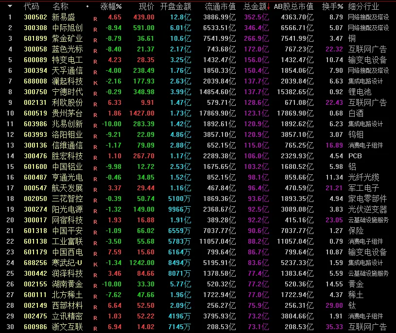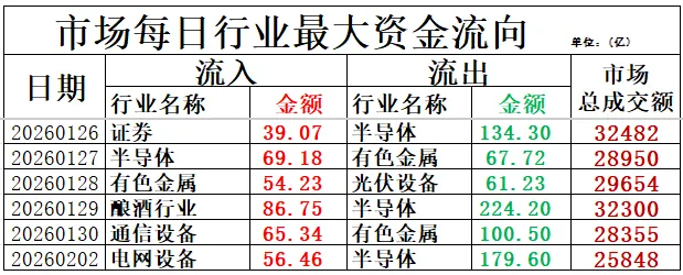 资金净流出前列:半导体、通信设备、有色金属等净流出排名靠前,其中半导体净流出179.60亿元。