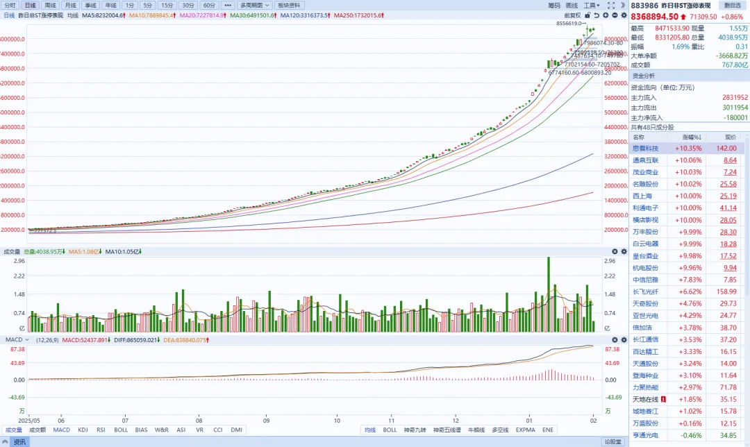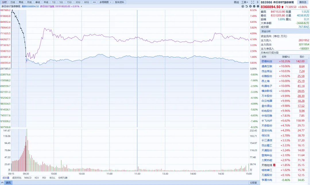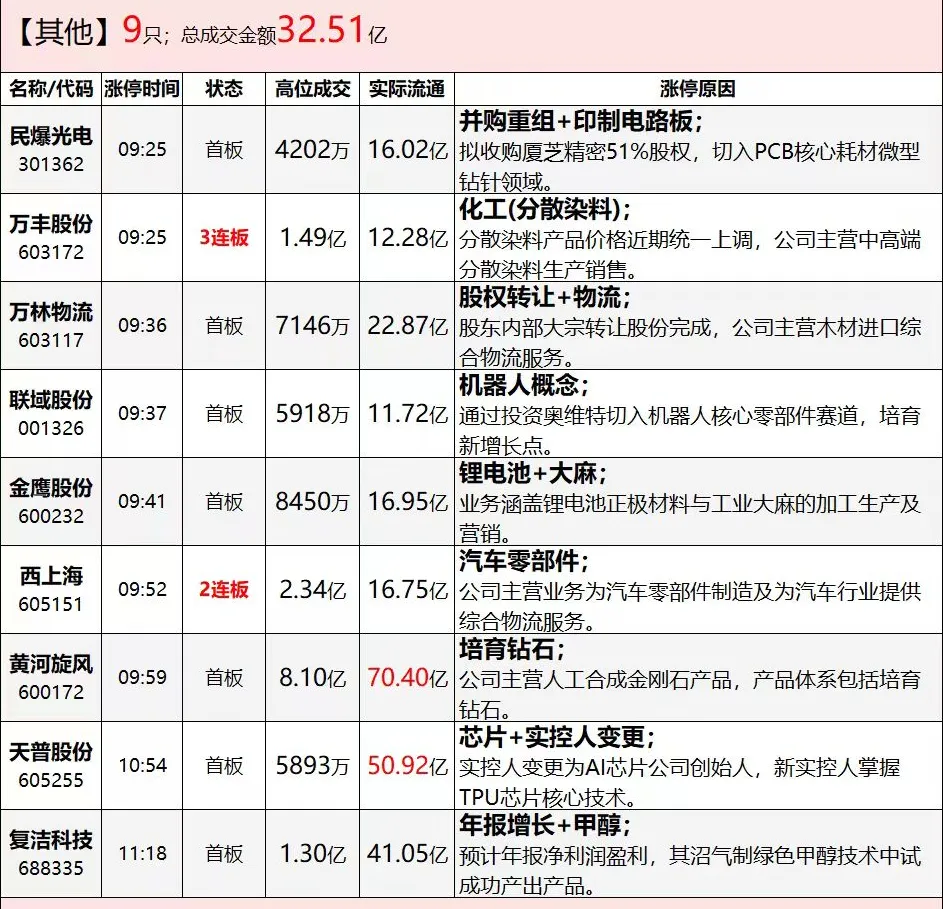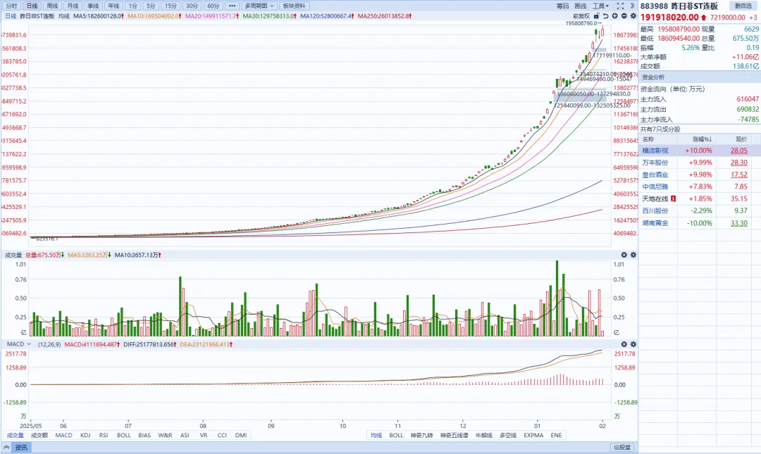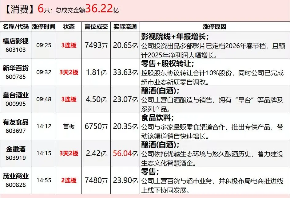 连板生态:今日全市场共36股涨停,连板股总数10只,18股封板未遂,封板率为67%(不含ST股、退市股)。焦点股方面,白酒股皇台酒业3连板,影视股横店影视3连板,化工股万丰股份3连板。