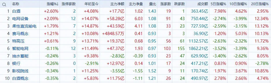 资金净流入前列:电网设备、酿酒行业、银行等净流入排名靠前,其中电网设备净流入56.46亿元。