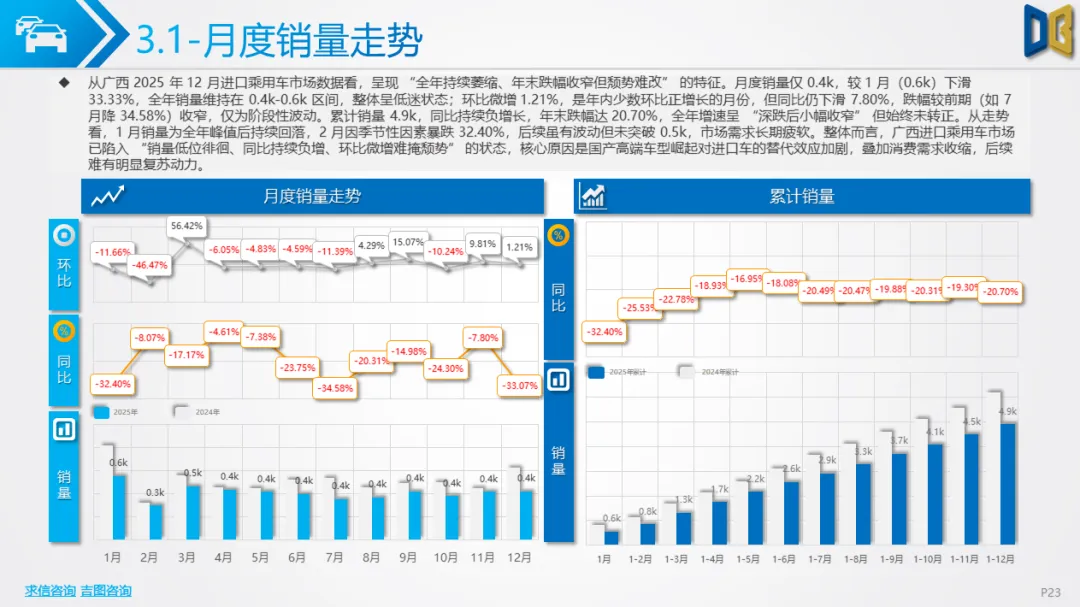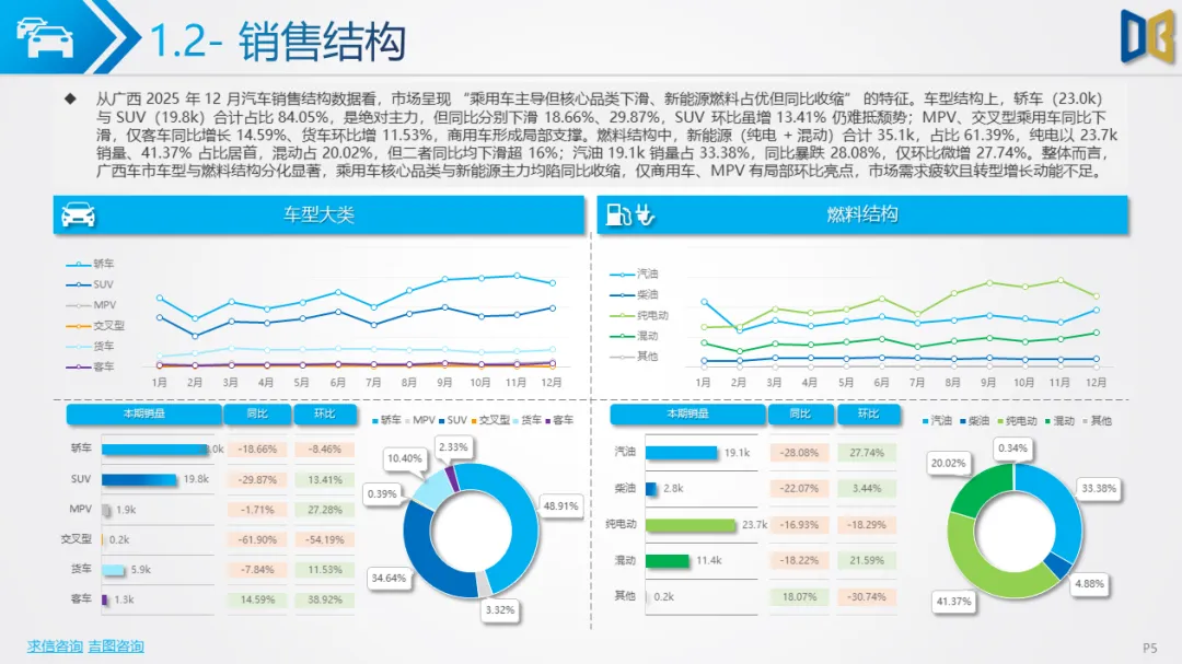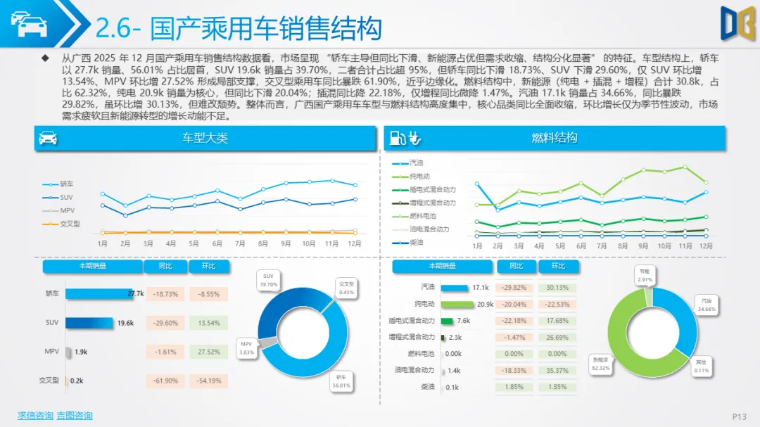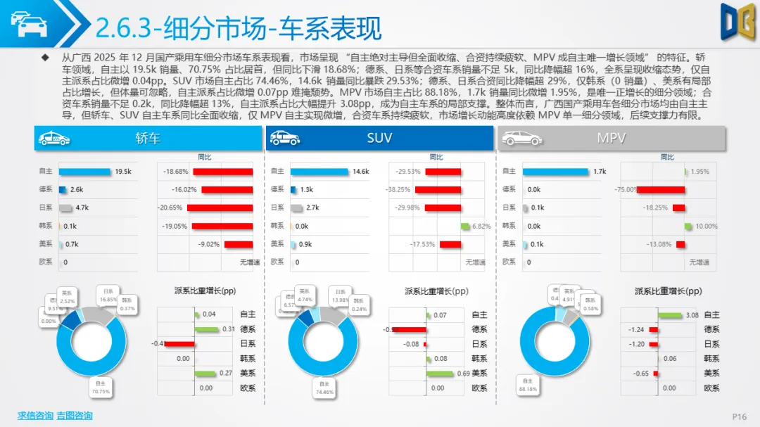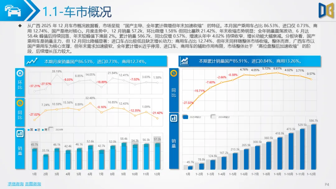 综上,2025年12月广西汽车市场是 “转型期 +存量期” 的典型缩影:国产乘用车在中低端维稳的同时向新能源突围,进口车陷入不可逆的衰退,商用车依托新能源与细分需求保持结构性增长。未来市场的竞争焦点将集中在国产新能源车型的渗透、商用车清洁化的替代,以及核心城市的存量用户争夺。