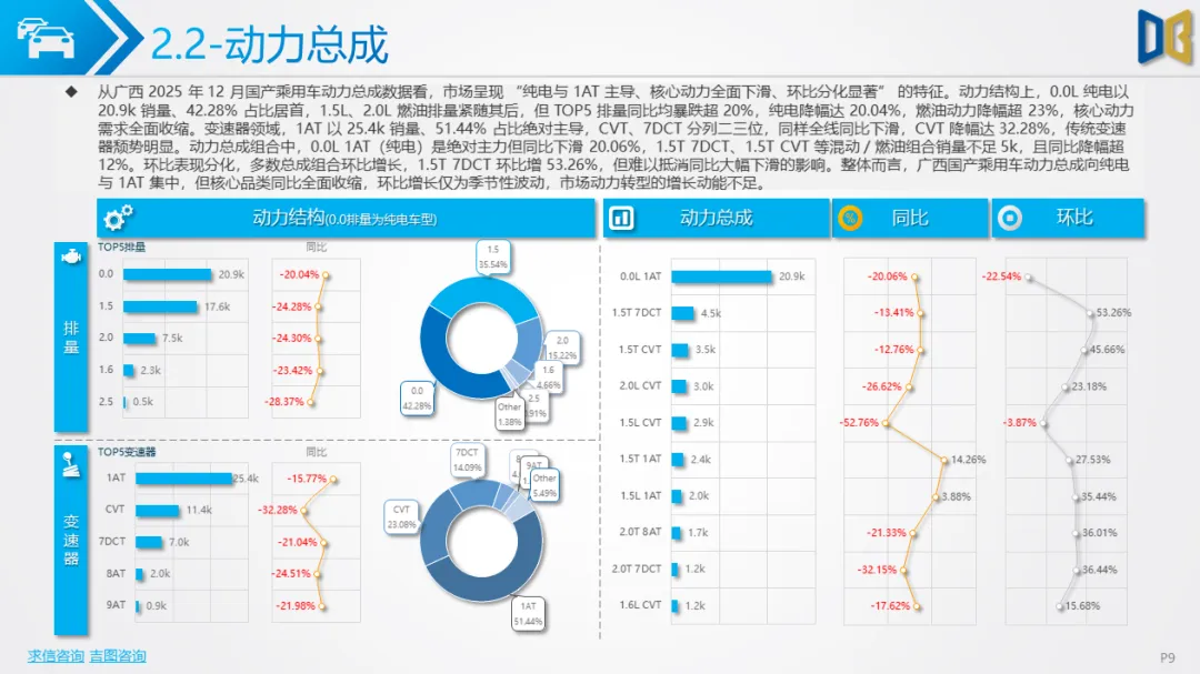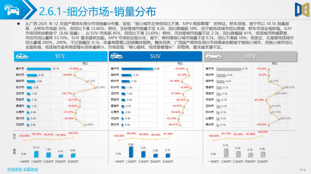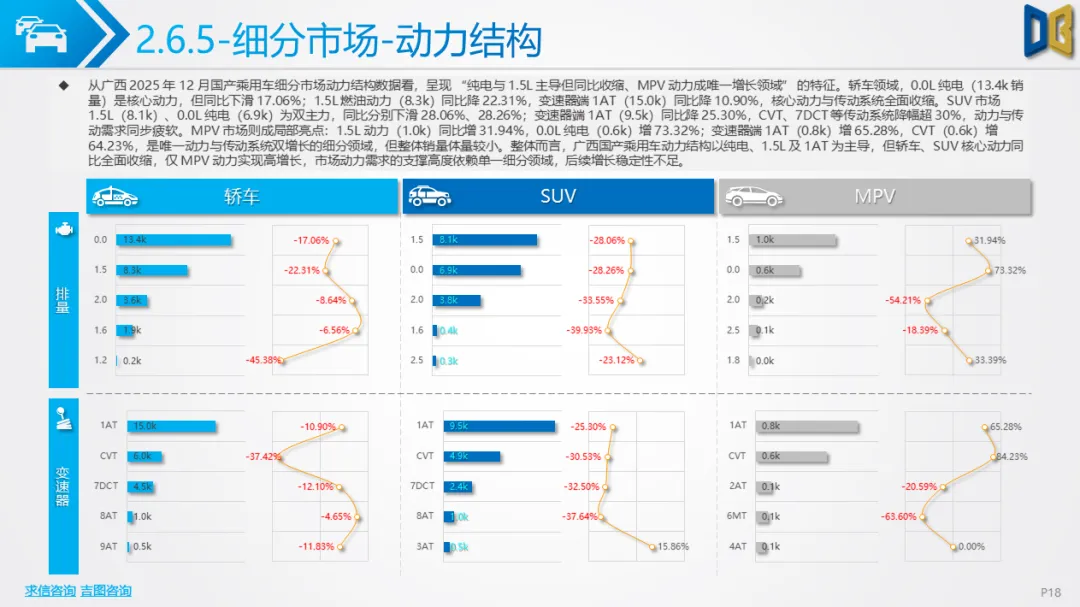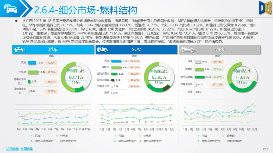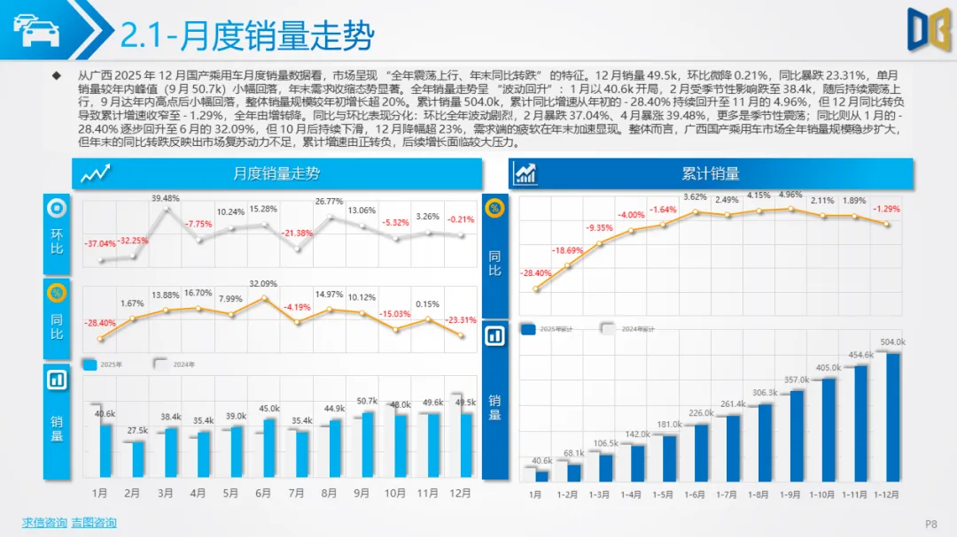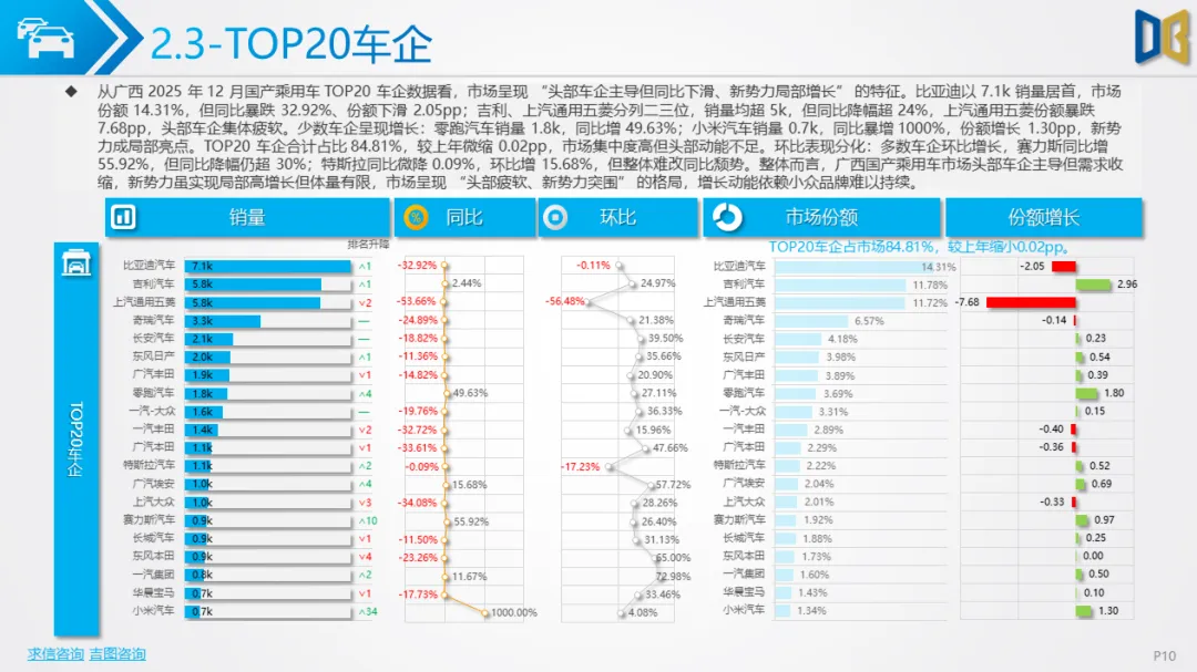 综上,2025年12月广西汽车市场是 “转型期 +存量期” 的典型缩影:国产乘用车在中低端维稳的同时向新能源突围,进口车陷入不可逆的衰退,商用车依托新能源与细分需求保持结构性增长。未来市场的竞争焦点将集中在国产新能源车型的渗透、商用车清洁化的替代,以及核心城市的存量用户争夺。
