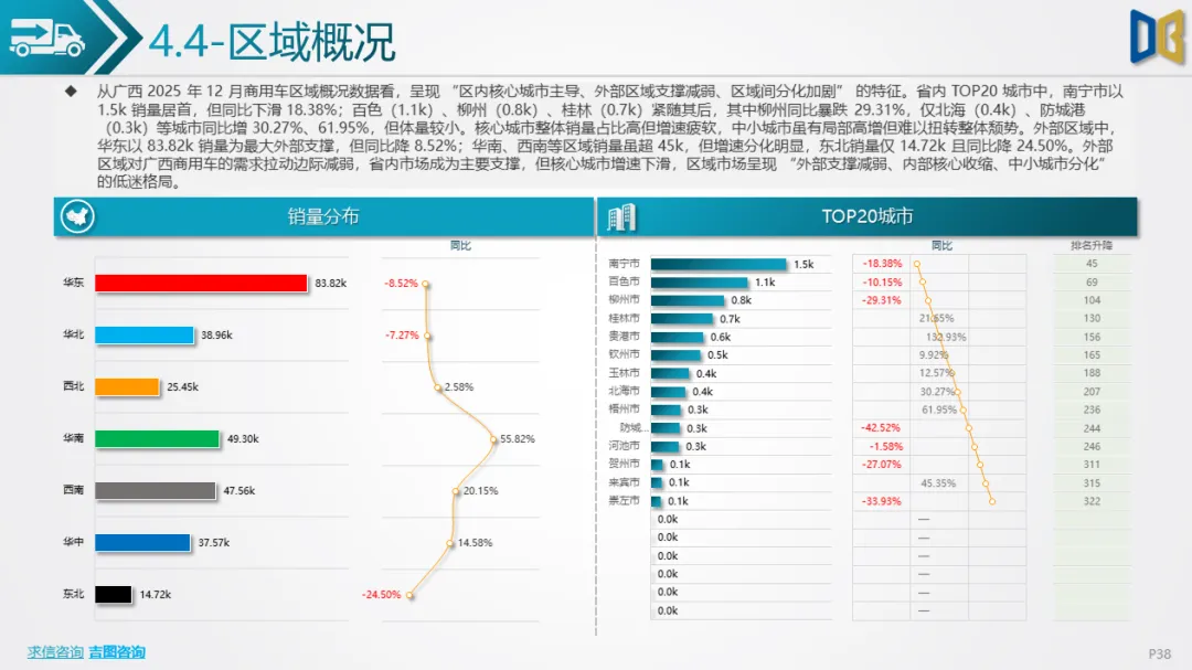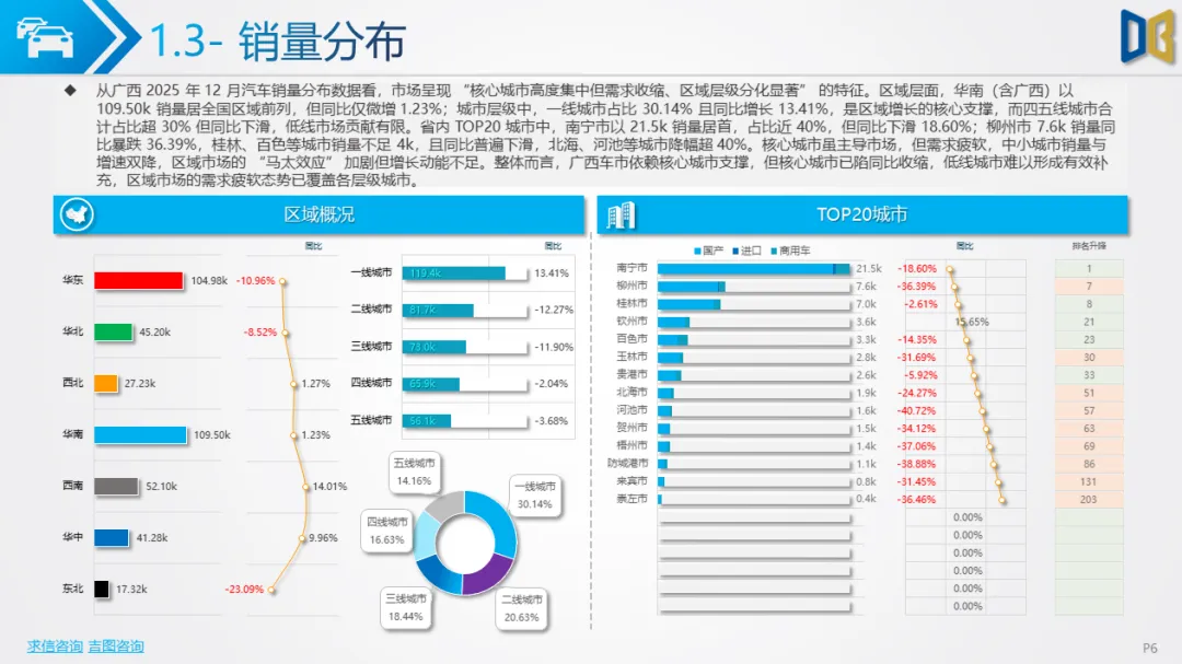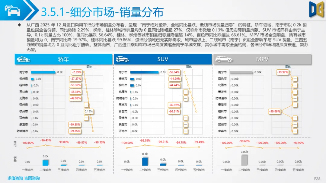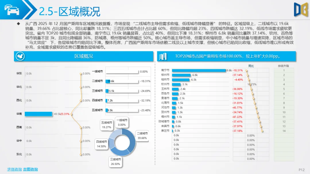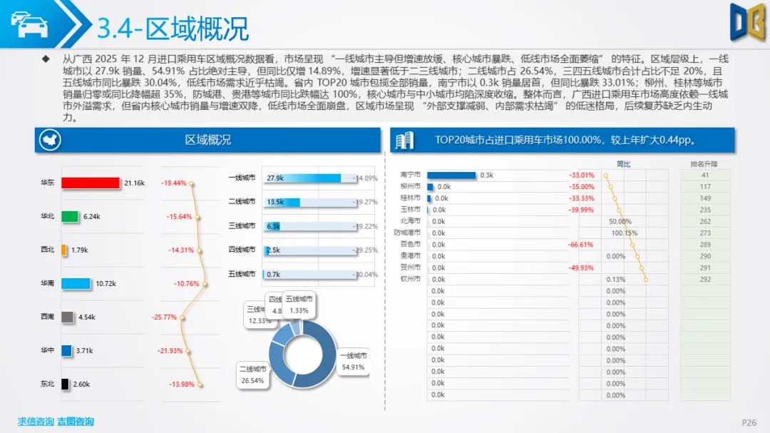 6.进口车仅依赖南宁单城,国产乘用车集中于二线城市,商用车核心城市增速下滑,低线市场需求持续萎缩,区域市场呈现 “核心维稳、外围收缩” 的格局,渠道与资源进一步向核心城市集中。