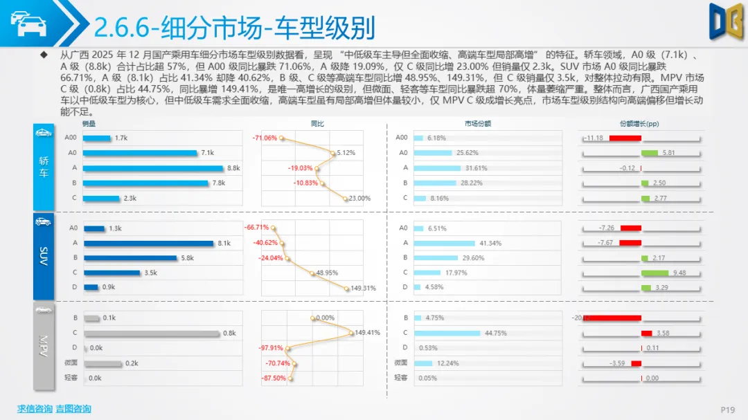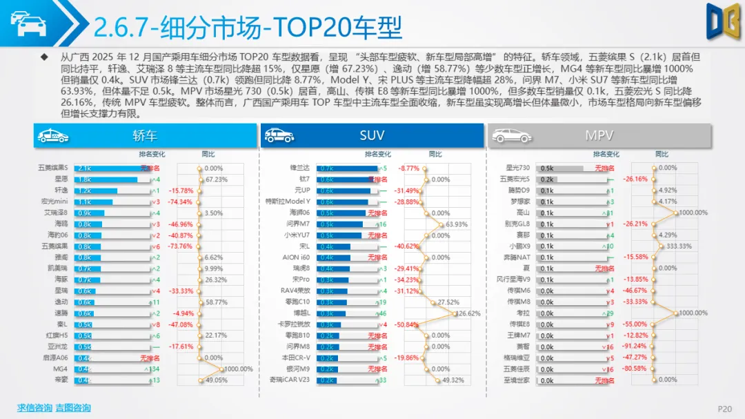 广西国产乘用车市场以中低端车型为基本盘,12 月核心细分领域呈现 “主流收缩、新兴突围” 的特征: