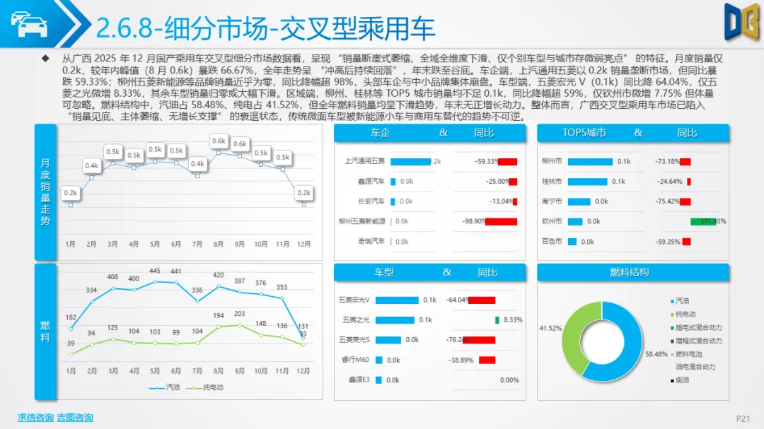 •交叉型乘用车:市场近乎消失,月度销量仅0.2k,同比暴跌超59%,传统微面车型被新能源小车与商用车完全替代,该细分领域已无复苏可能。