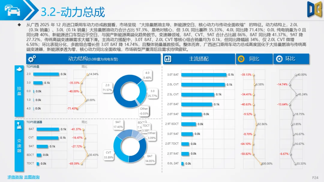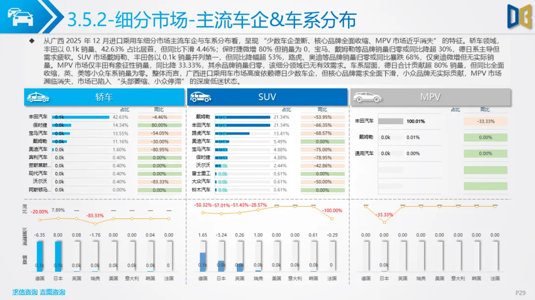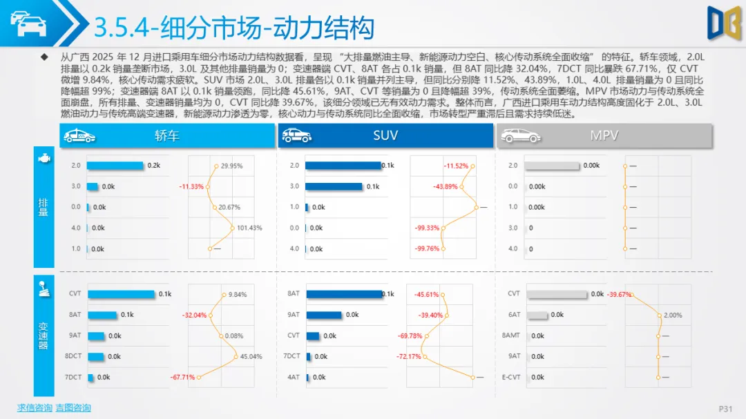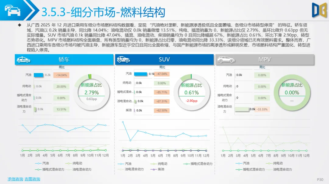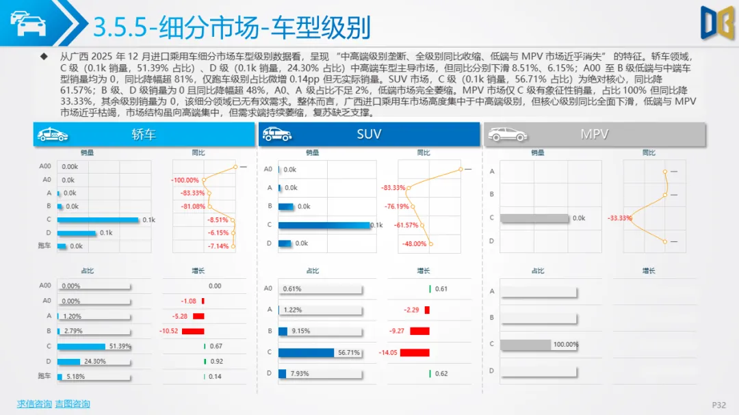 广西进口乘用车市场陷入 “销量见底、结构固化、转型停滞” 的困境,12 月数据反映出显著的替代效应与需求收缩: