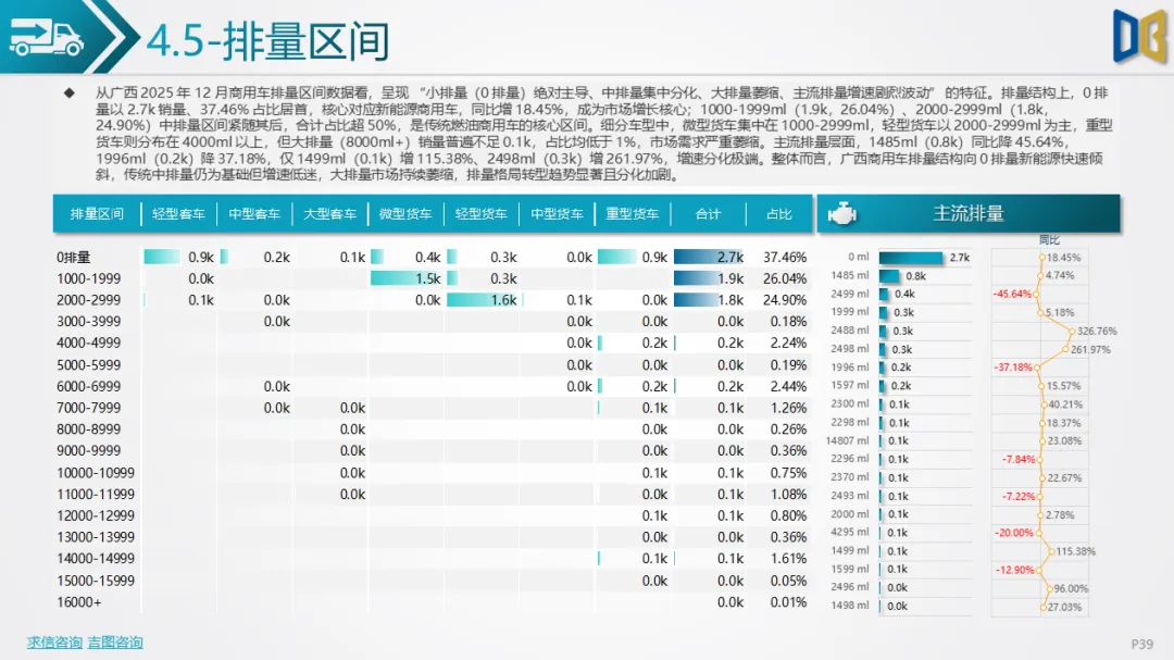 •燃料上,柴油(2.7k)与纯电(2.7k)销量持平,纯电同比增18.45%,新能源商用车渗透率达37.47%,成为市场增长核心;CNG车型(0.2k)同比增18.07%,清洁燃料车型需求稳步提升。