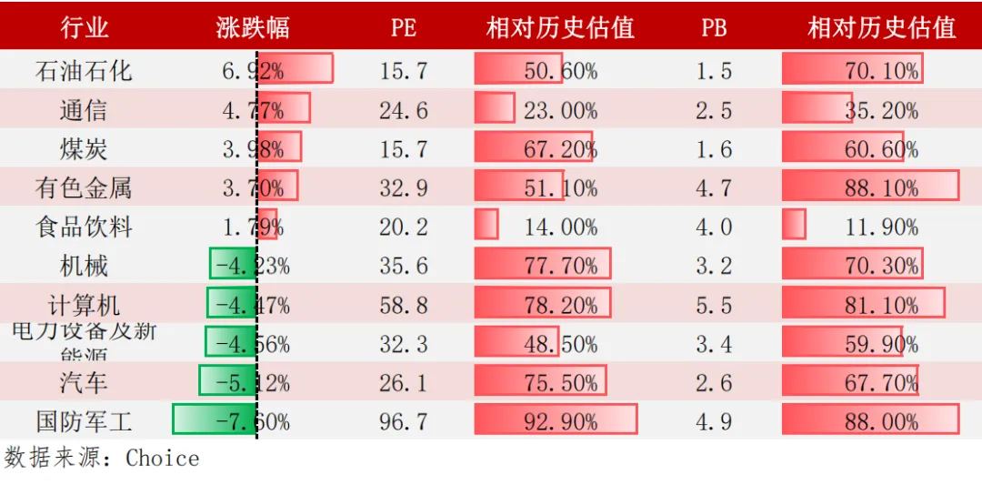 表2:中信行业一周表现及估值(涨跌幅前五和后五)
