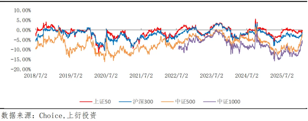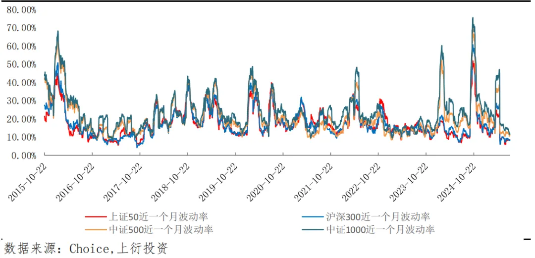 上周上证50、沪深300、中证500、中证1000一个月历史波动率均处于偏低水平。期权隐含波动率方面,50ETF、300ETF、1000股指期权隐含波动率有所上升。