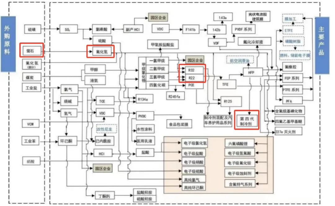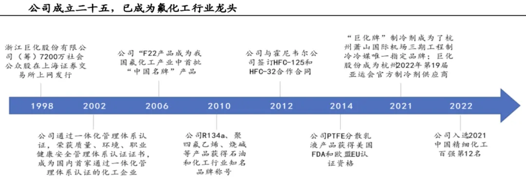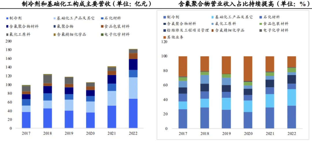 制冷剂:拥有一至四代含氟制冷剂系列产品。2代制冷剂R22产能国内第二;三代制冷剂全球龙头地位,混配小包装制冷剂市场占有率全球第一位。是国内用自有技术实现第四代氟致冷剂产业化生产的企业。 含氟聚合物:公司现有PTFE、PVDF、FEP、FKM、PFA、ETFE等系列氟聚合物产品,产能保持快速增长态势。PVDF已覆盖涂料、太阳能背板膜、水处理膜、电线电缆、锂电池粘结等下游产业。公司HFP、PTFE、FEP、FKM产能规模位居行业领先地位。 氯碱化工:随着公司氟化工核心主业、氟氯联动战略的确立,氯碱化工有望实现高质量发展。公司氯碱化工由基础氯碱,向氟化工配套及以PVDC为主的氯碱新材料转型。公司发展壮大甲烷氯化物、PCE、TCE、VDC、PVDC等特色氯碱产品,形成自我特色的氯碱化工产业。公司氟化工和氯碱化工两个业务紧密联动,发挥协同效应,规模化降低生产成本,实现收益最大化,并与其他企业差异化竞争。公司烧碱产品规模处浙江省第一位;三氯乙烯、四氯乙烯、甲烷氯化物产能居前;VDC、PVDC产业产能规模跃居全球首位,产品逐步向多元化、高端化、终端化拓展,国内市场占有率位居第一,综合竞争力稳居全国前列。 石化材料:公司涉及部分石化行业产品,并积极布局石化新材料。公司拥有二十多年的己内酰胺生产经验,具有部分资源配套优势,综合技术水平处于行业领先地位。公司重点发展特色石油化工和高分子材料,与传统石化企业差异化发展,做大做强石化新材料业务,提升核心竞争力、优化整体空间布局。 煤化工:公司存在区域优势。公司煤化工产品主要是液氨、甲醇等,是支撑公司氟化工产业发展的基本原材料。公司正在实施“合成氨原料路线及节能减排技术改造”,利用先进的洁净煤气化技术改造传统煤化工,打造“煤-甲醇、合成氨”产业链,并逐步转化为“氟化工原料-工业气体”供应商、有机废水处理商。作为浙江省唯一一家合成氨、甲醇生产企业,公司液氨产品区域市场需求稳定,基本已确立浙西区域主导地位。