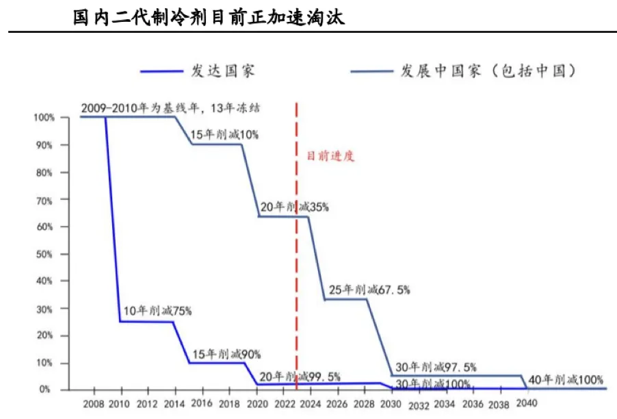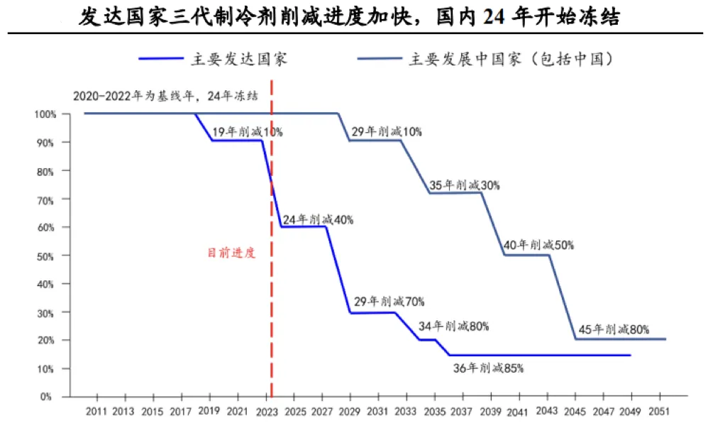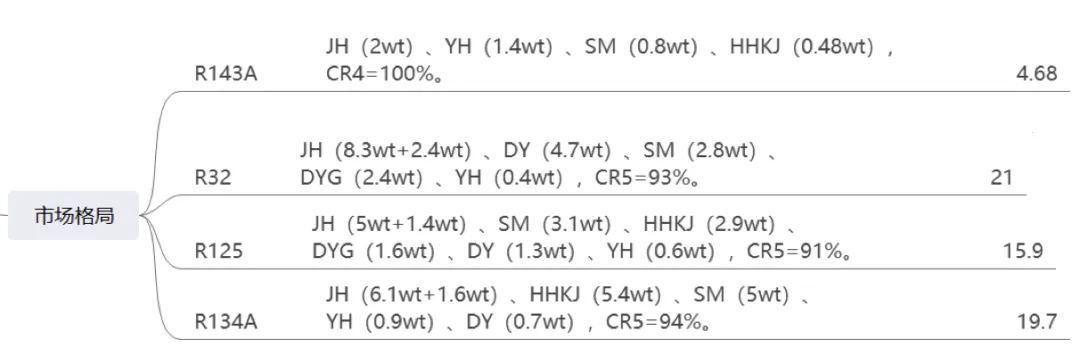 三代制冷剂R32的配额分配:巨化(8.3wt+2.4wt)、东岳(4.7wt)、三美(2.8wt)、东阳光(2.4wt)、永和(0.4wt),CR5=93%。