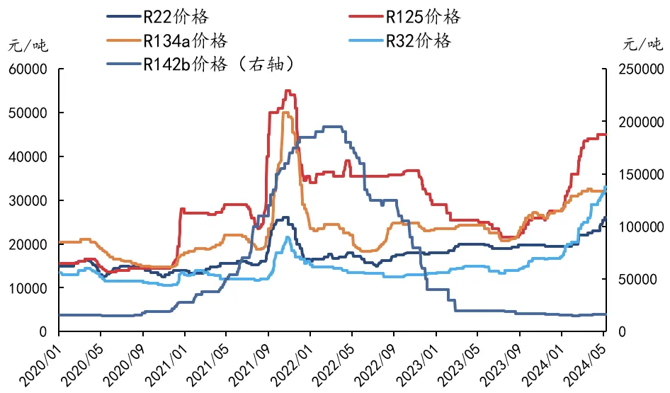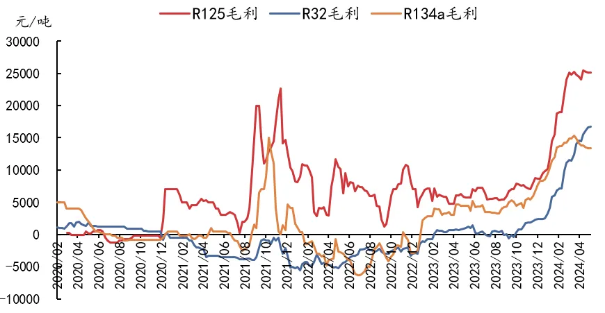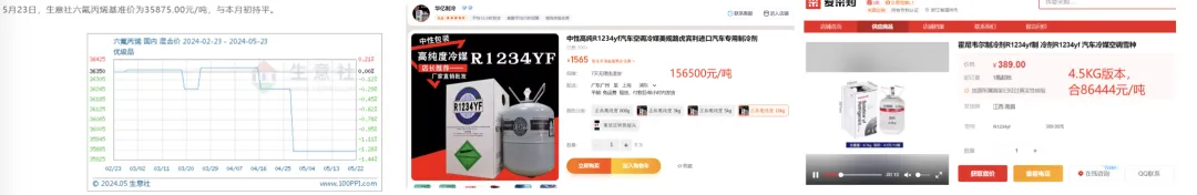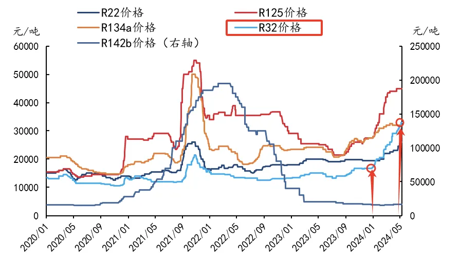 过去3三年时间里因为挣钱配额,行业恶性竞争,低价销售抢份额,销售都是签订的长协。进入24年开始经销商反馈已经放弃框架长协,跟随市场价格出货。而且参考历史制冷剂涨价情况。以巨化为例参考历史R125,以及海外。R134a历史最高是30W/吨,目前3.2W,R125历史最高是15万/吨,目前4.2W。